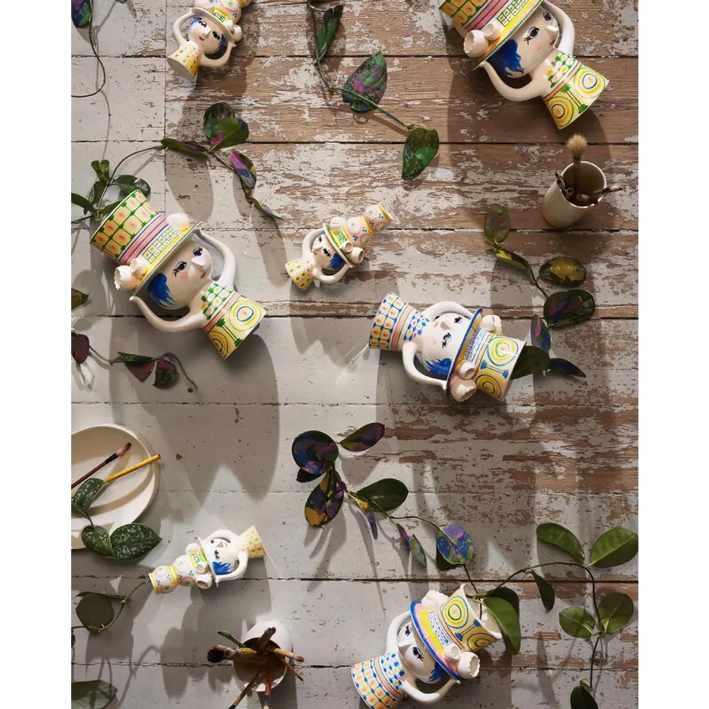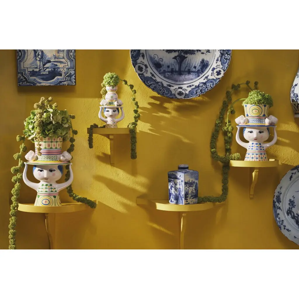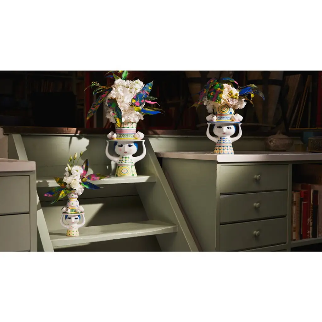 Bjørn Wiinblad's Lady with Hat vase showcases a charming female figure adorned with a vibrant, oversized hat, setting the perfect stage for a sprawling bouquet or arrangement. Even without the embellishment of blooms, this graceful lady, with her meticulously hand-painted attire, enchants any space with her presence. Beloved Danish artist Bjørn Wiinblad, renowned for his magical style and exquisite ornaments, created many feminine characters throughout his career. The Lady with Hat series captures his affinity for dramatic headpieces with a whimsical flair. Made from hand-painted ceramics, these figures radiate joy and serve as timeless tokens of affection, making them exceptional gifts as well.