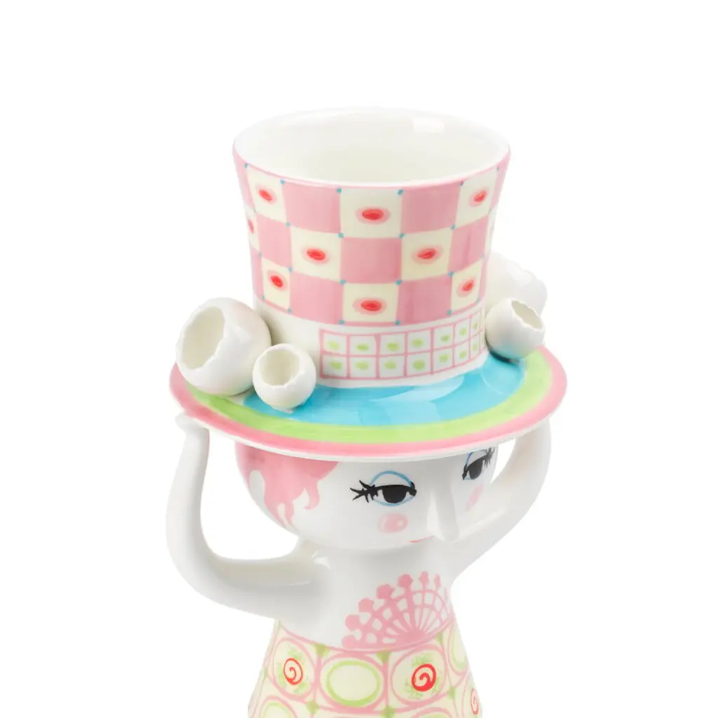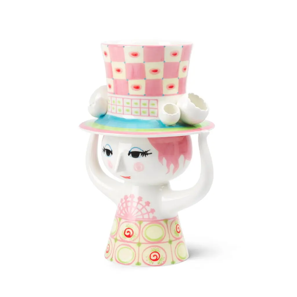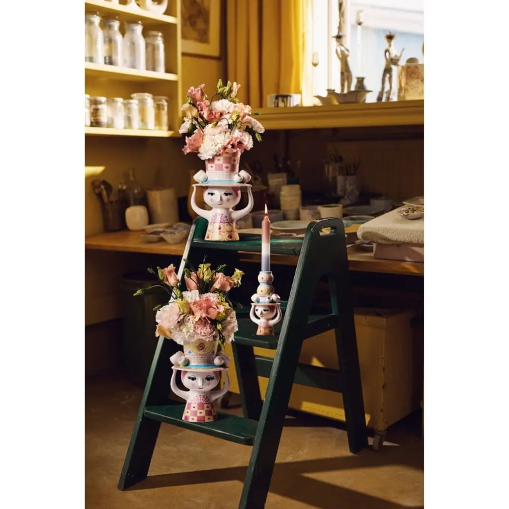 Bjørn Wiinblad's Lady with Hat vase showcases a charming female figure adorned with a vibrant, oversized hat, setting the perfect stage for a sprawling bouquet or arrangement. Even without the embellishment of blooms, this graceful lady, with her meticulously hand-painted attire, enchants any space with her presence. Beloved Danish artist Bjørn Wiinblad, renowned for his magical style and exquisite ornaments, created many feminine characters throughout his career. The Lady with Hat series captures his affinity for dramatic headpieces with a whimsical flair. Made from hand-painted ceramics, these figures radiate joy and serve as timeless tokens of affection, making them exceptional gifts as well.