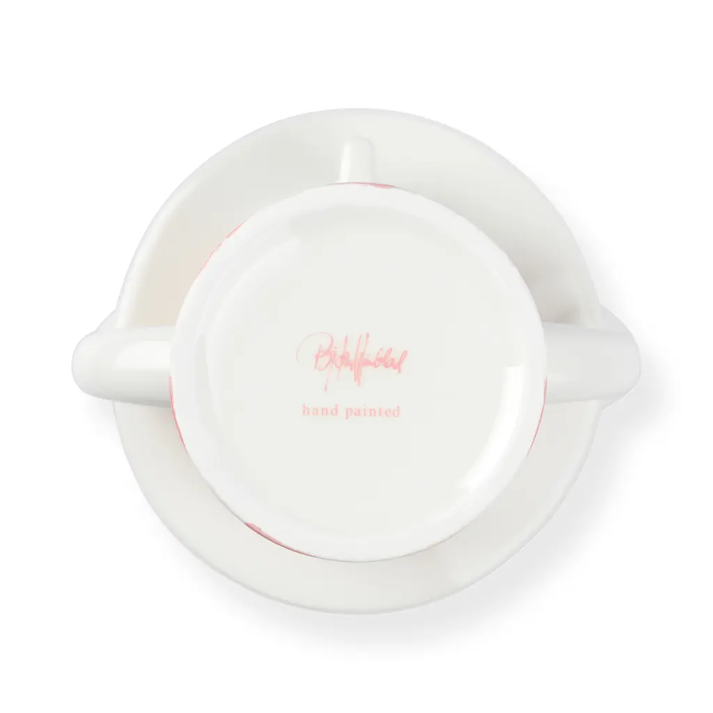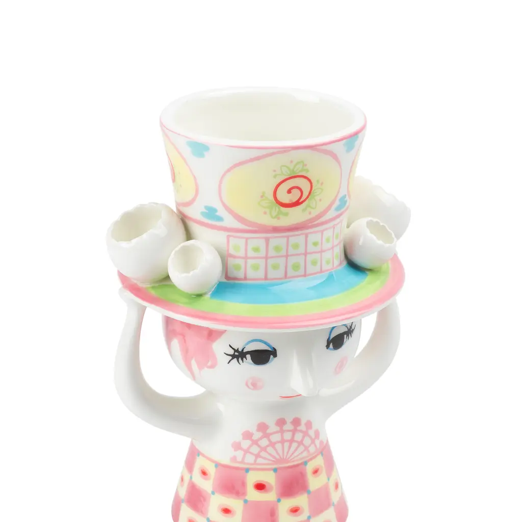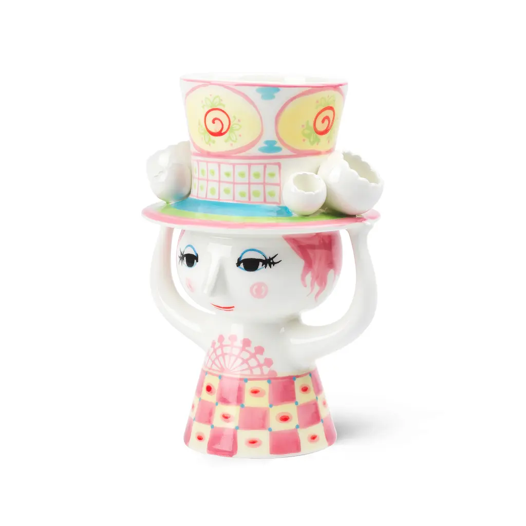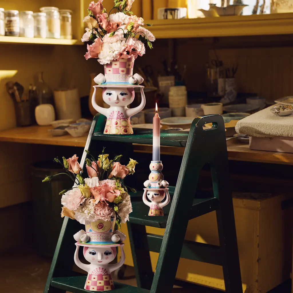 This Lady with Hat vase in pink and yellow is one of Bjørn Wiinblad’s more detailed creations. Her cylindrical body features a bold checkered pattern in red and cream, while the tall sculptural hat balances graphic shapes and pastel tones with precision. A pair of ceramic tulips on each side adds texture and character. Standing 8.1 inches tall, the vase is made from glossy glazed ceramic and finished by hand. Her signature expression—complete with curved lashes, rose-colored cheeks, and a quiet smile—draws from Wiinblad’s original sketches and gives this piece its unmistakable personality. Use it with or without flowers—it holds its own either way.