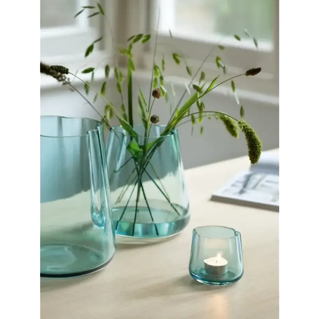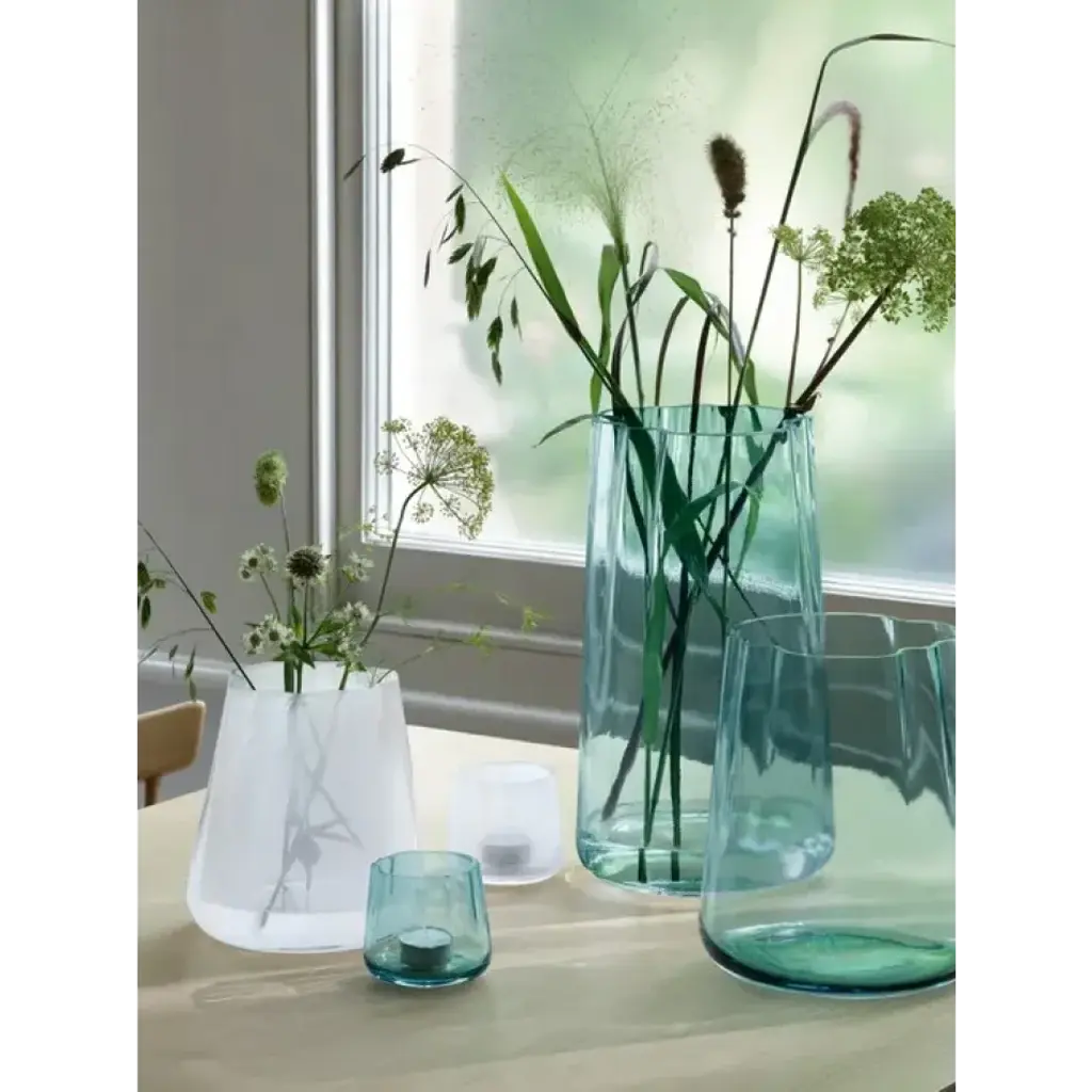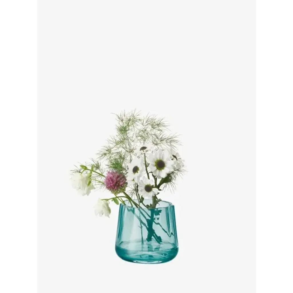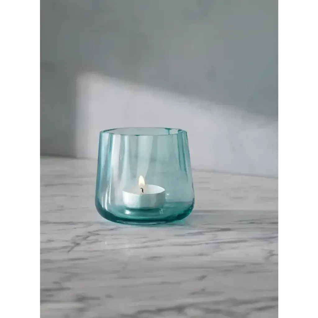 A mouth-blown tealight holder with an organic form, inspired by a lagoon. Suitable as candleholder, mini pot or vase, naturally arranging flowers in the undulating folds of the glass. Available in cased sea green glass.