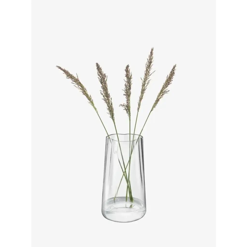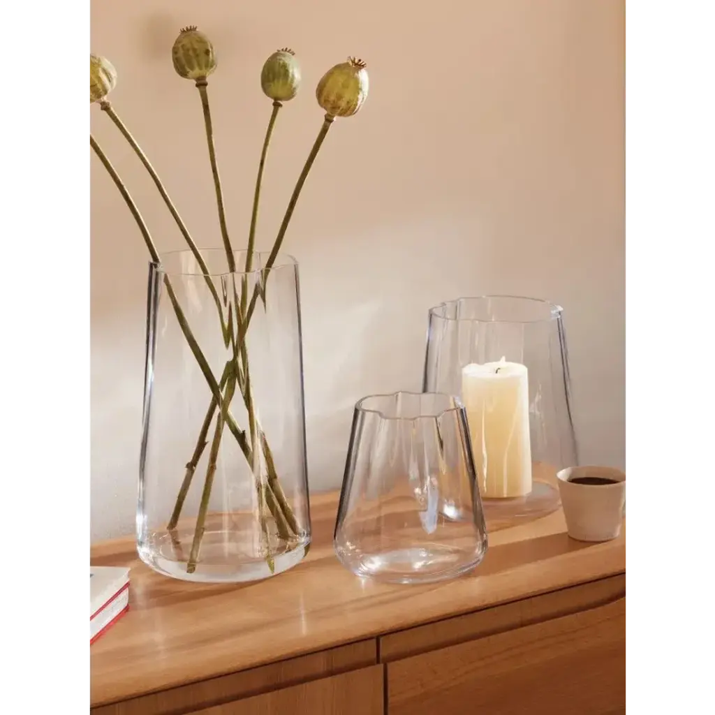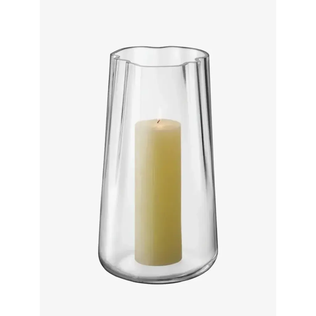 A tall mouth-blown vase/lantern with an organic form, inspired by a lagoon. Suitable as a lantern or vase, naturally arranging flowers in the undulating folds of the glass. Available in clear or sea green glass. Mouth-blown glass Organic shape For use as lantern or vase Available in clear or sea green
