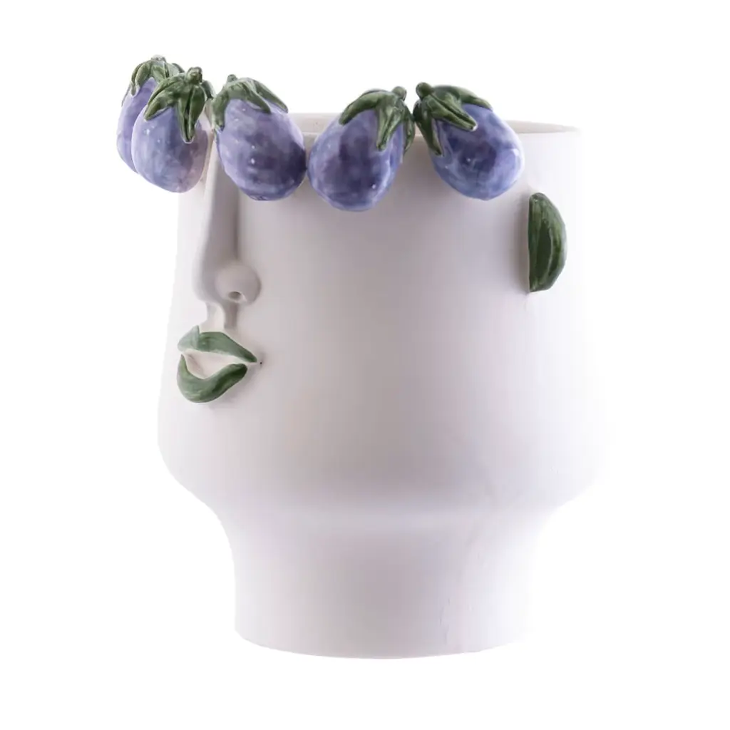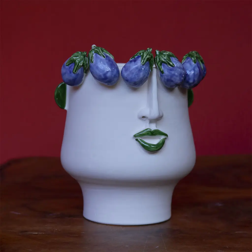 The second fire-fired ceramic head, handmade with face and aubergine reliefs, can be used to contain plants, flowers and sometimes even bottles with ice. "Ammuttunata" is an ancient Sicilian recipe where small aubergines were cooked in the sauce and filled with pieces of garlic and mint.