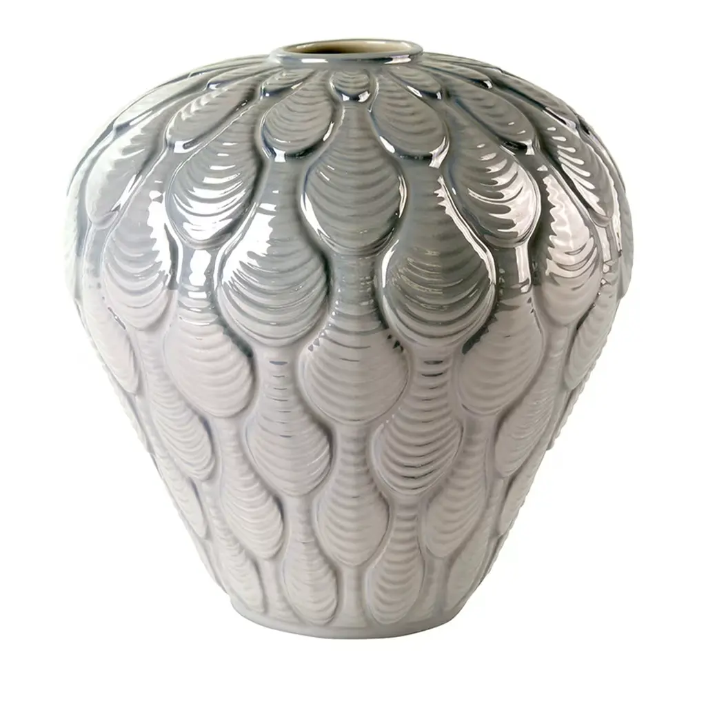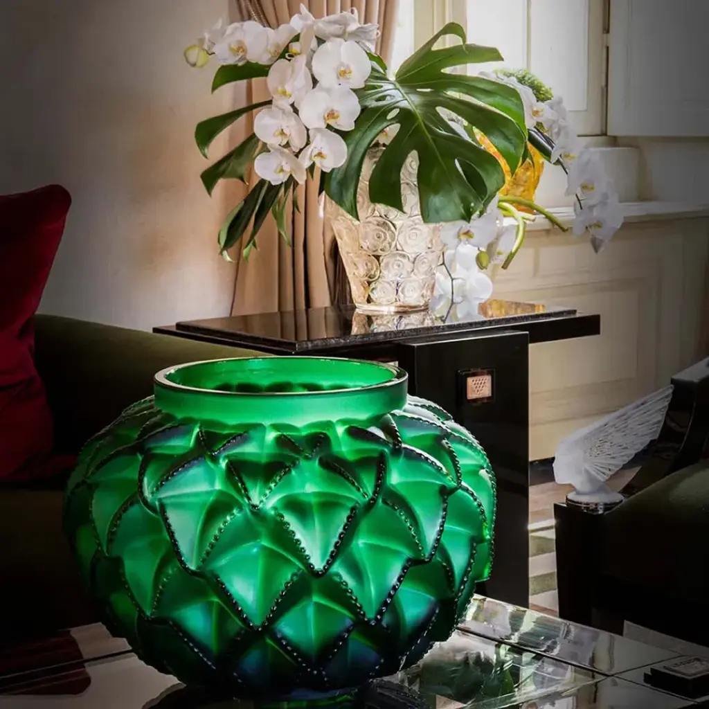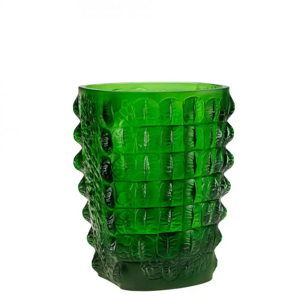 The Languedoc vase takes us to the lands of the Languedoc. Between sea and mountains, this sundrenched region in the South of France offers many landscapes: wide open spaces, shrubland, ancient massifs and beautiful gorges. The raw beauty of this land has inspired many artists, including René Lalique who designed this vase with accentuated relief and generous proportions in 1929. Fashioned in satin-finished and re-polished crystal, cactus leaves overlay in a graphic play on repetition. Trained as a jeweler at the Ecole des Arts Decoratifs in Paris in the late 1880's, Rene Lalique gained recognition as an independent designer for some of the era's great jewelry houses including Cartier and Boucheron. Eventually, he turned to glassmaking, and his techniques were a triumph for the Art Deco movement. Every piece of Lalique is finely detailed and produced by hand in Alsace, France.