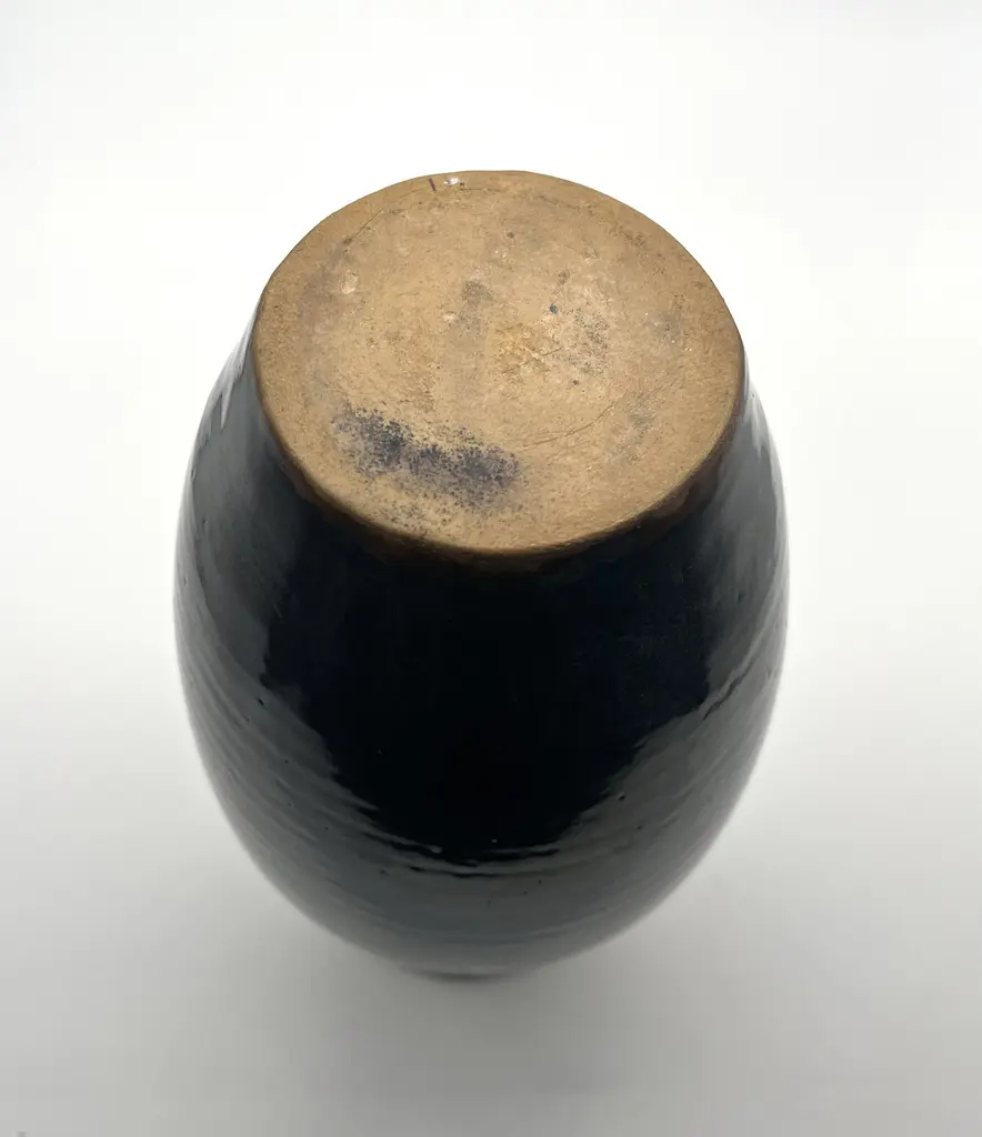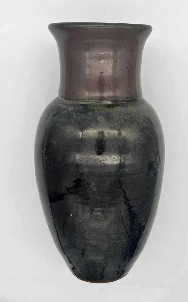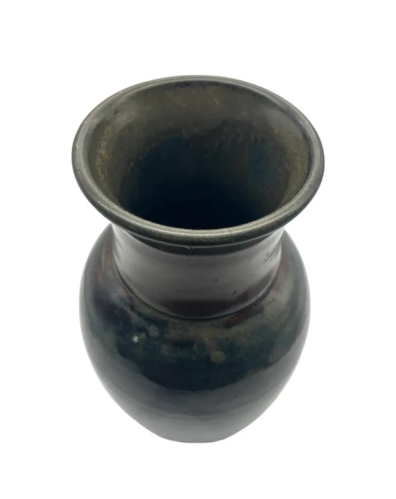 Large Mid-Century Modern C. 1970s high glazed brown/purple ceramic vase in with metallic over glaze throughout the body giving an irridescent quality in most lights. The neck is a matte brown/purple ceramic. Substantial midcentury piece of art pottery.