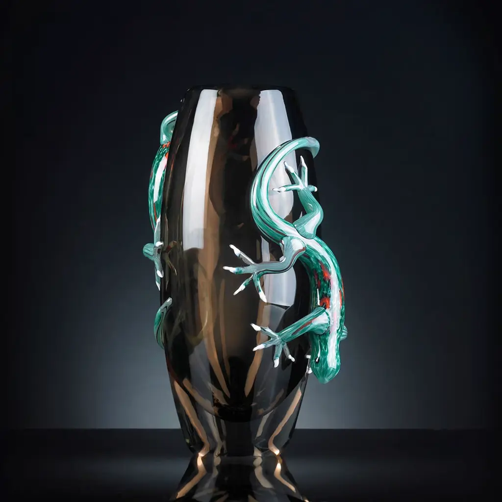 Distinguished by a striking use of color, this vase is part of a refined series of sculptural objects. Entirely handcrafted of glass using traditional techniques, its modern flair is given by the elegant combination of brown shades with the vivid turquoise hues of the two geckos enriching the surface.