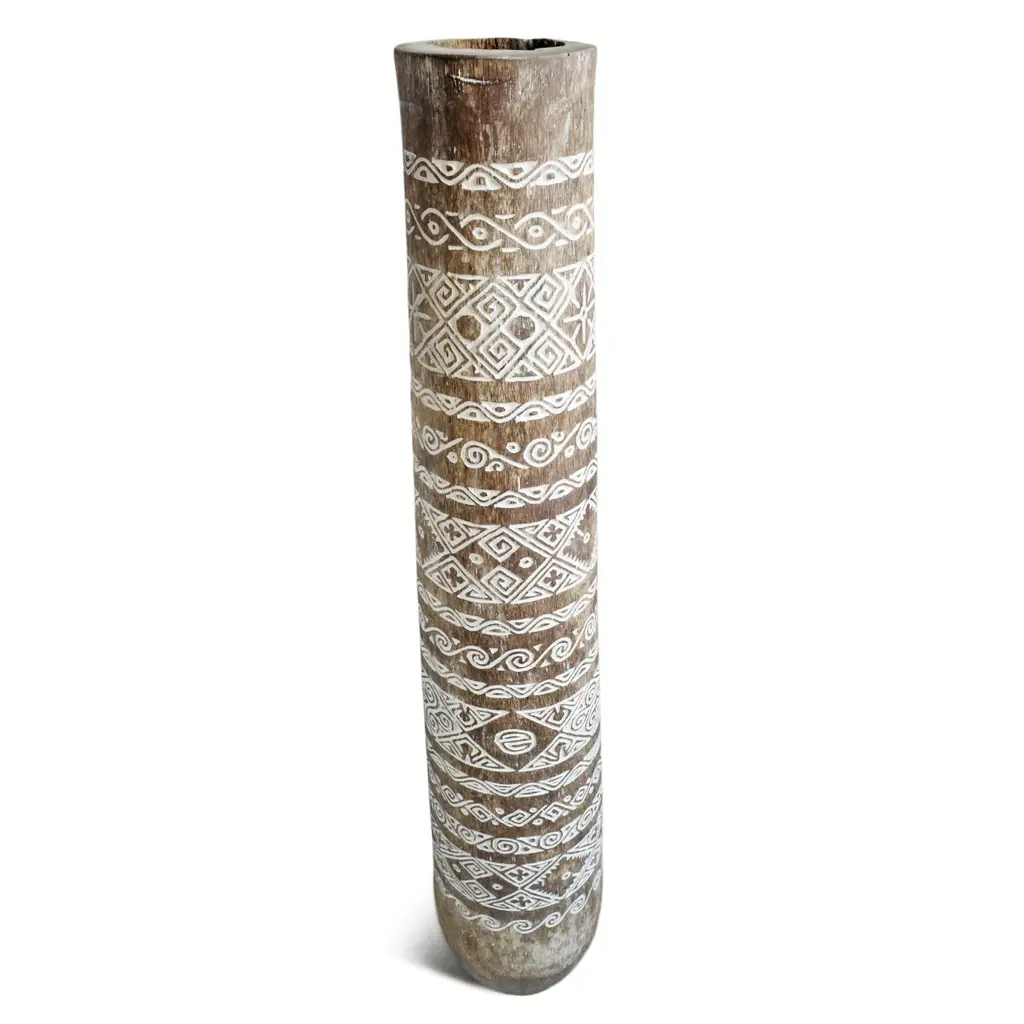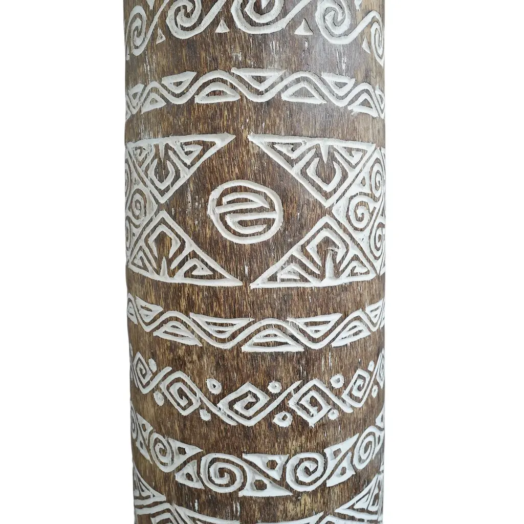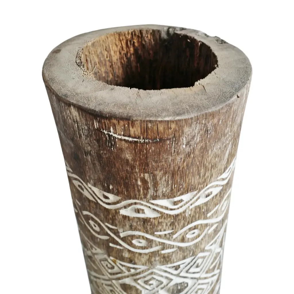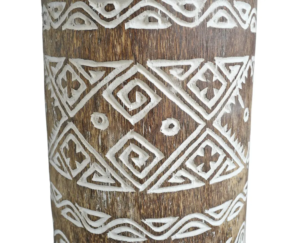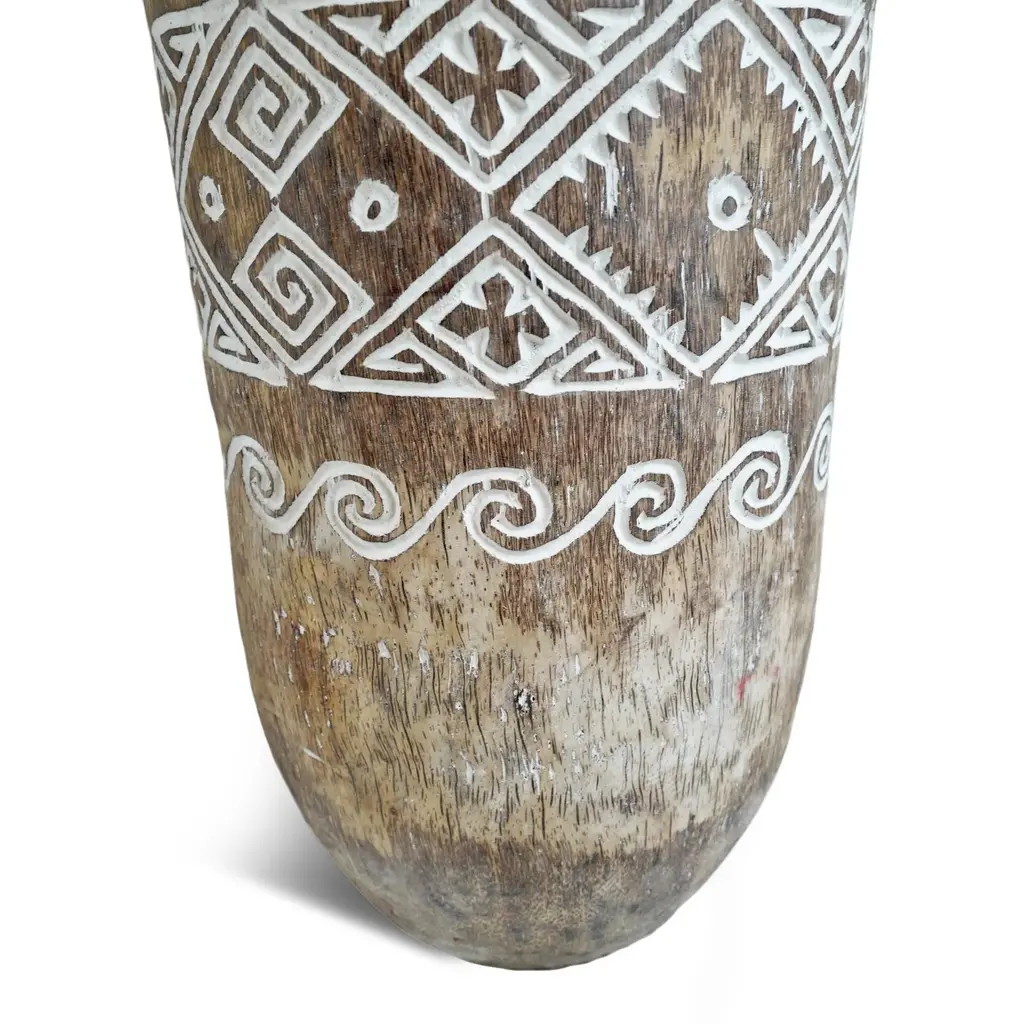 Large hand carved coconut palm urn with beautiful cream painted indigenous design patterns which are unique to each piece. Opening at top is 7" diameter. Natural grain and tones vary. Natural imperfections are a part of the character of the material and are to be expected. Wonderful displayed on its own or as a grouping. Each sold individually.