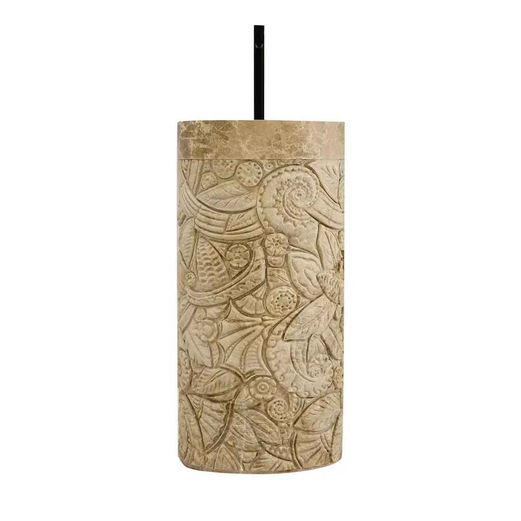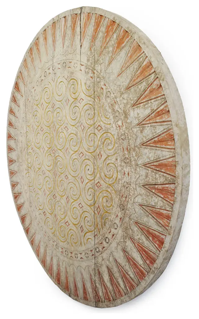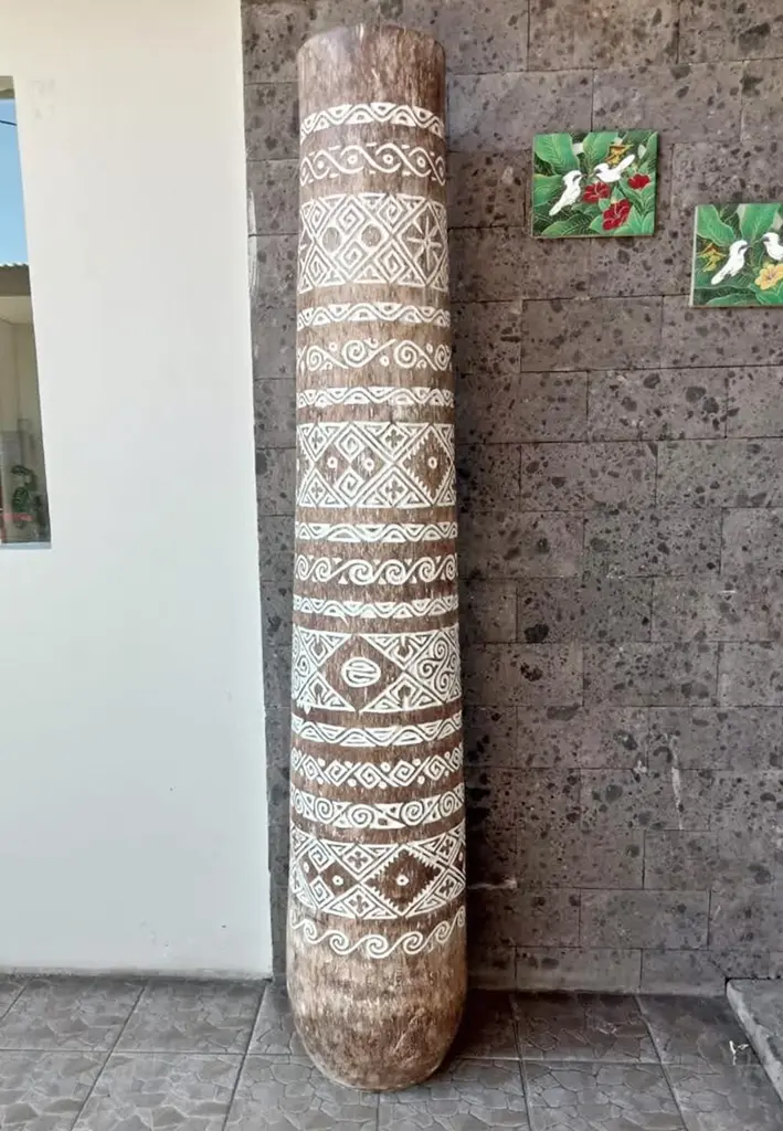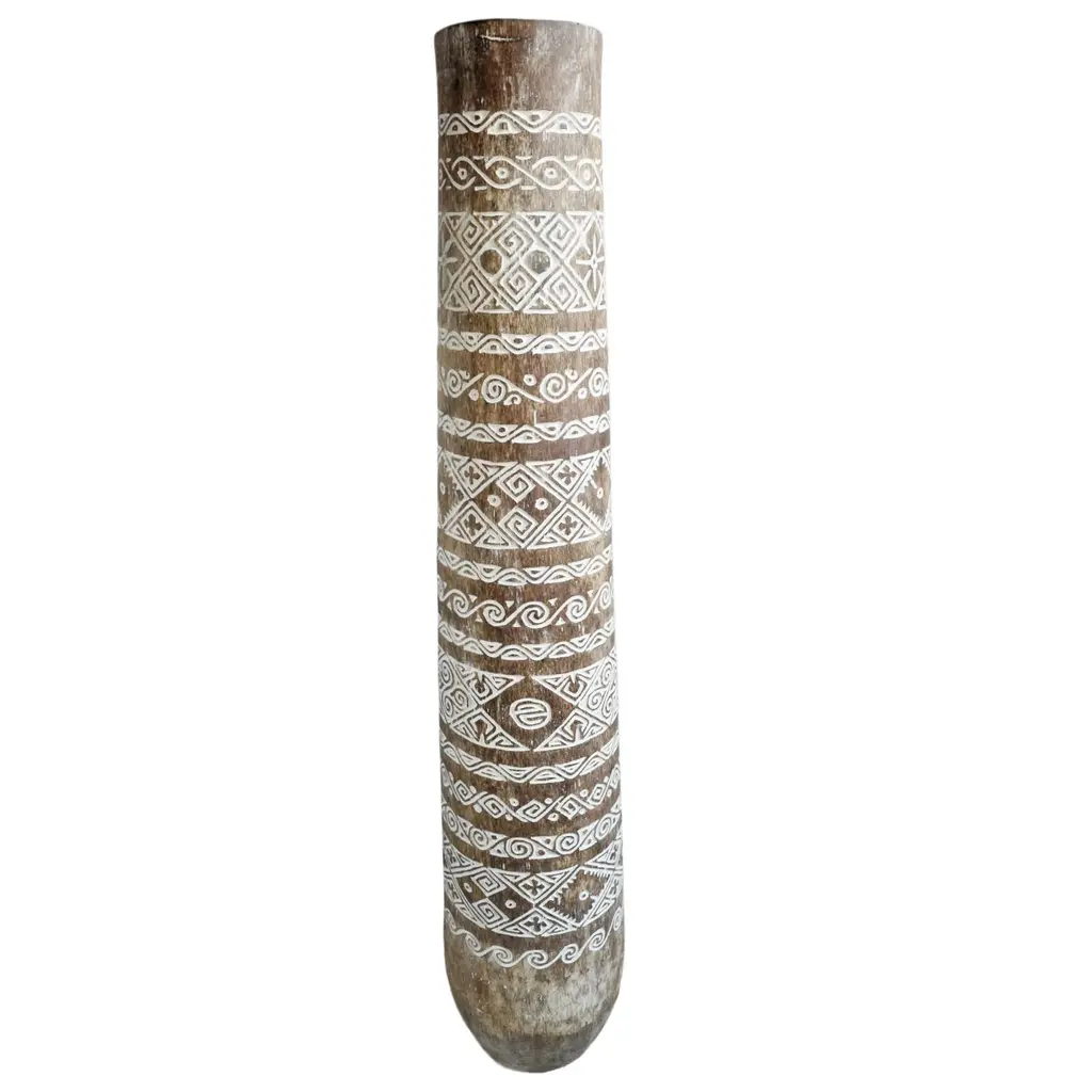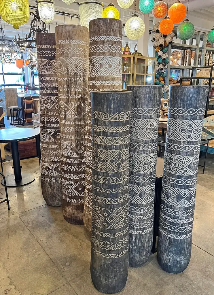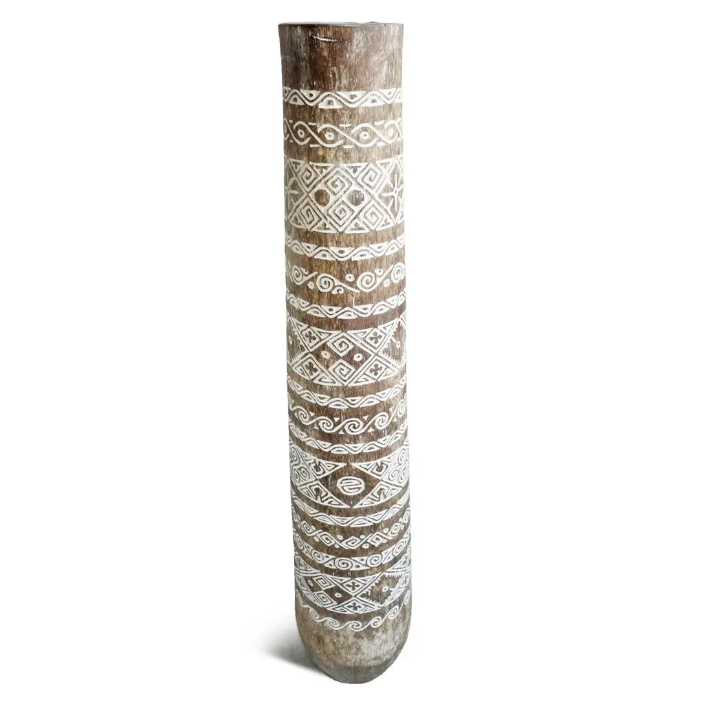 Large hand carved coconut palm urn with beautiful cream painted indigenous design patterns which are unique to each piece. Opening at top is 7" diameter. Natural grain and tones vary. Natural imperfections are a part of the character of the material and are to be expected. Wonderful displayed on its own or as a grouping. Each sold individually.
