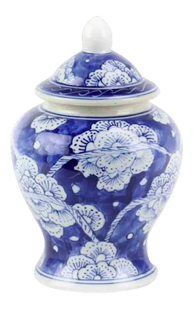 Hand Painted Blue Ceramic Vase With A Removable Lid And Decorated With A White Vine Design.
