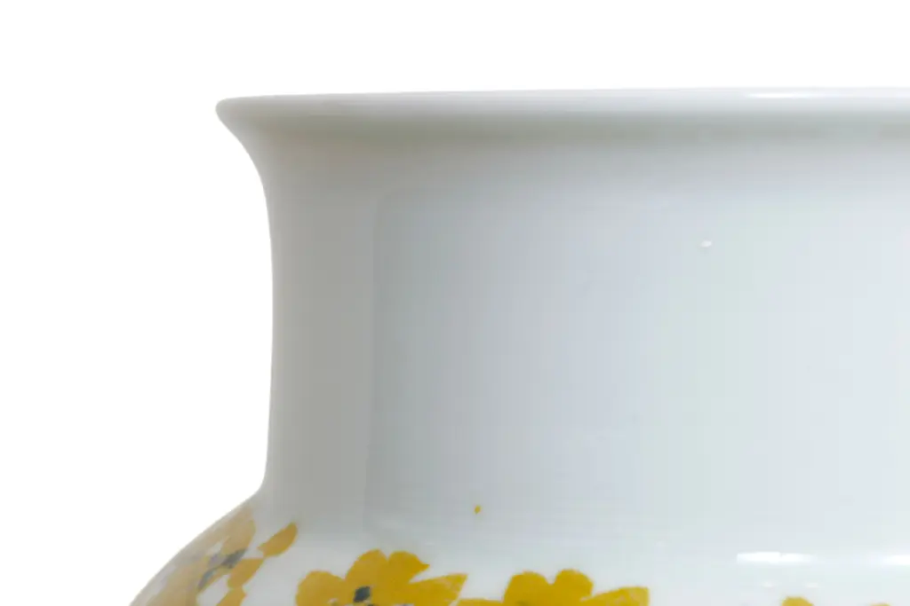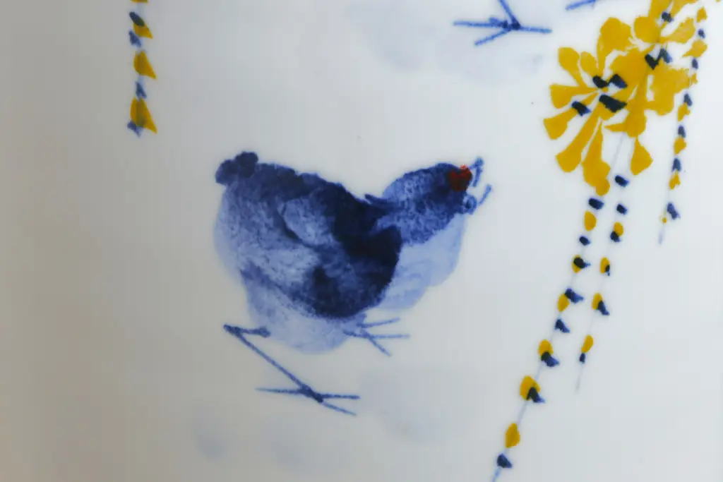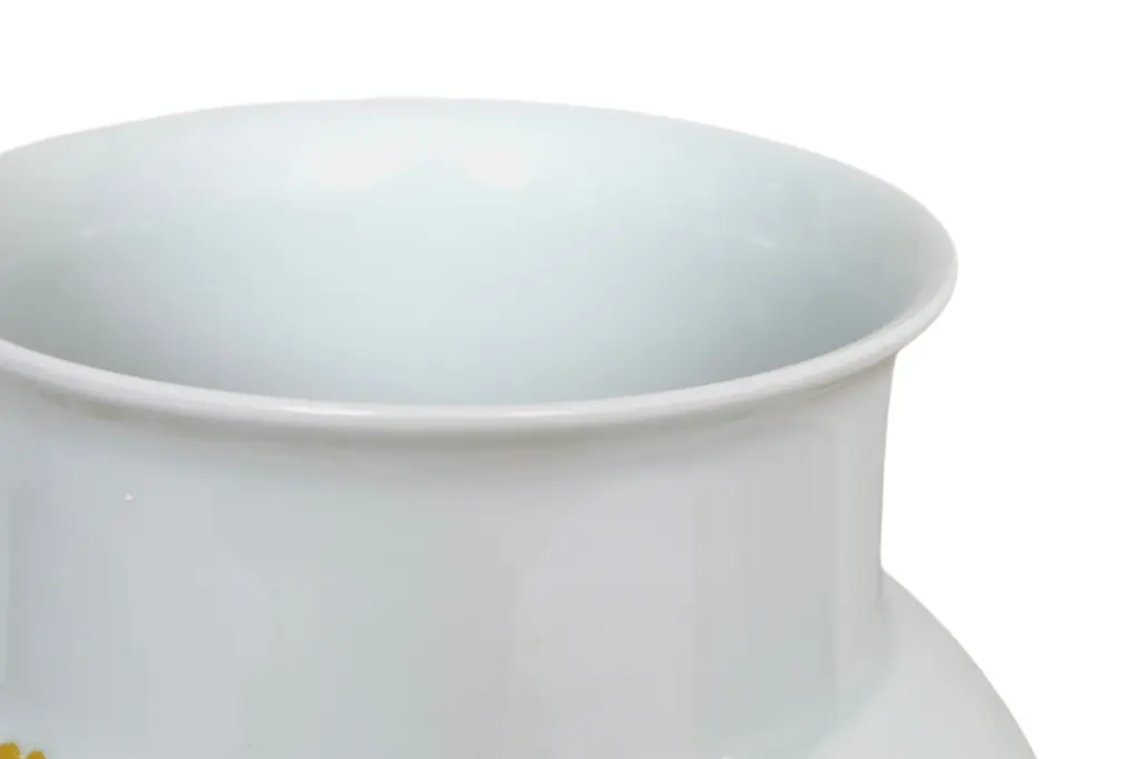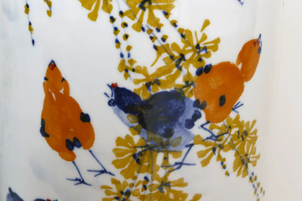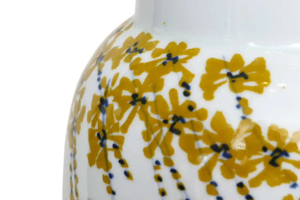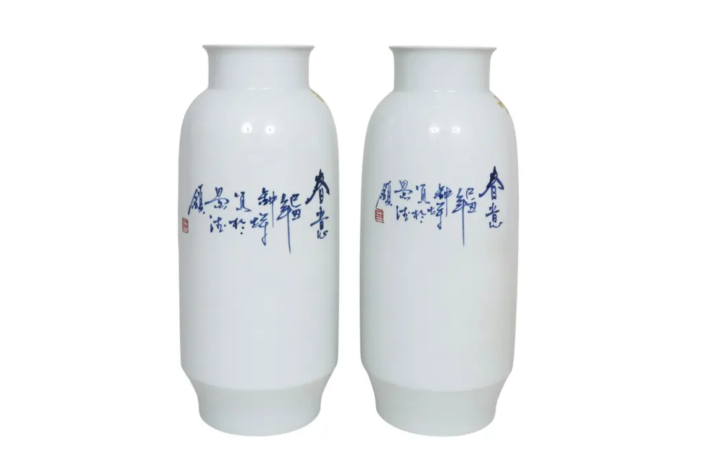 A large pair of contemporary Chinese hand painted ceramic vases. Decorated in front with trailing weeping willows in yellow and little birds in blue and orange. In the back, vases are signed with the artist's signature and date of creation, "��午冬日���� (Ji��wǔ Dōng Rì Xuān Zuò)," indicating it was made in the winter of the jiawu year (2014). They are also signed with the ���San Yang Kai Tai" phrase, a well-known Chinese saying associated with good fortune and a promising future.