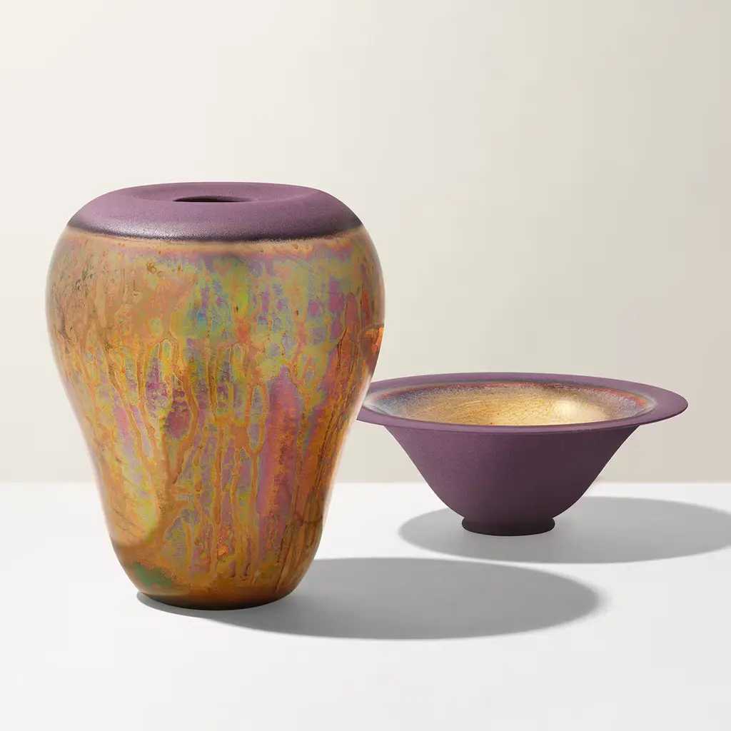 Evocative of the Impressionist painters' vibrant color palettes, the hand-painted bronze hues and indigo top of this unique ceramic vase will capture the delicate light reflections on the mesmerizing polychrome glaze. Standing tall with its rounded profile, this unique vase creates a lovely design accent on a shelf or a tabletop. Entirely crafted on a lathe, the unique chromatic effect is obtained using a complex process that requires a 3-stage firing in the kiln.