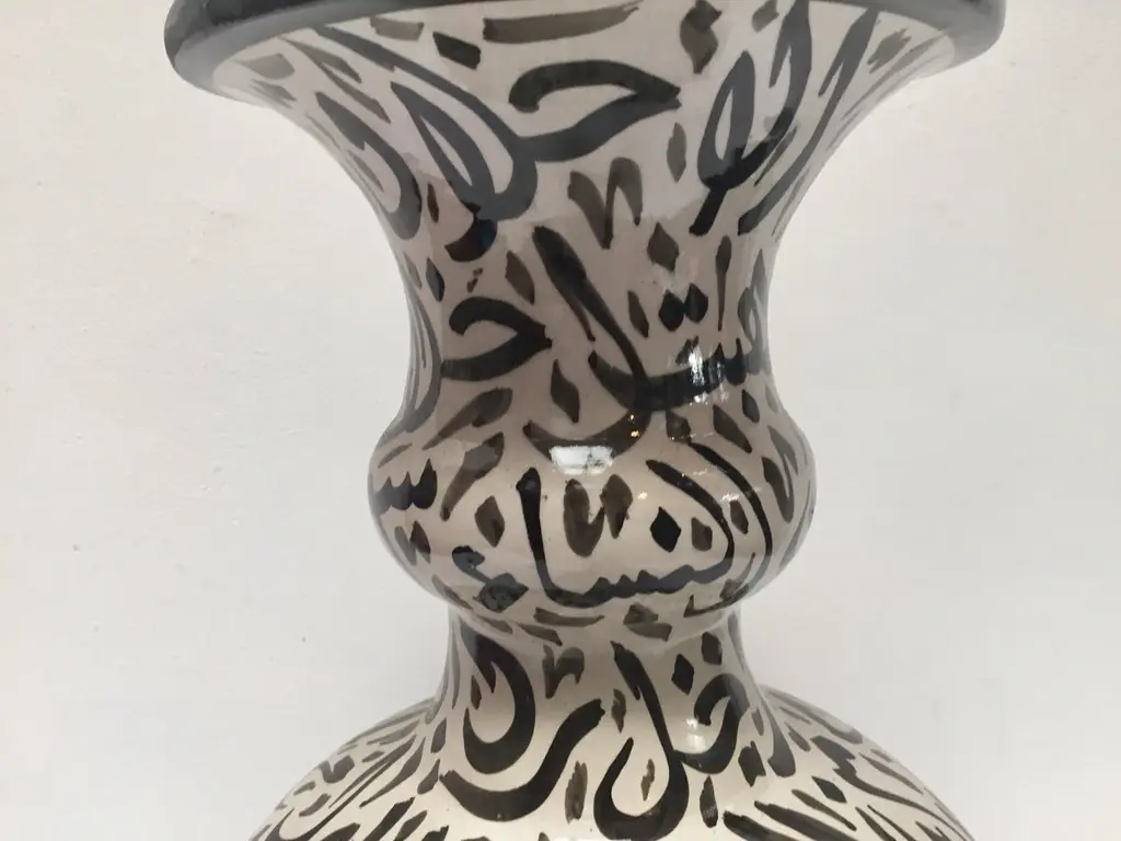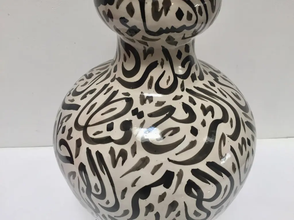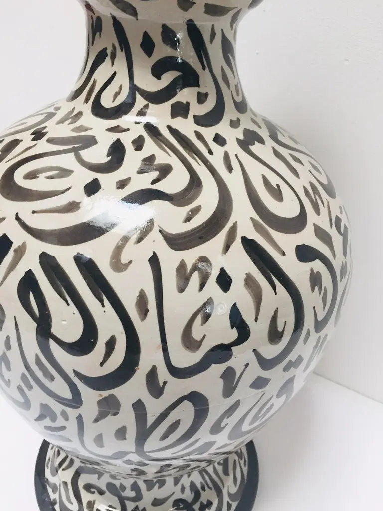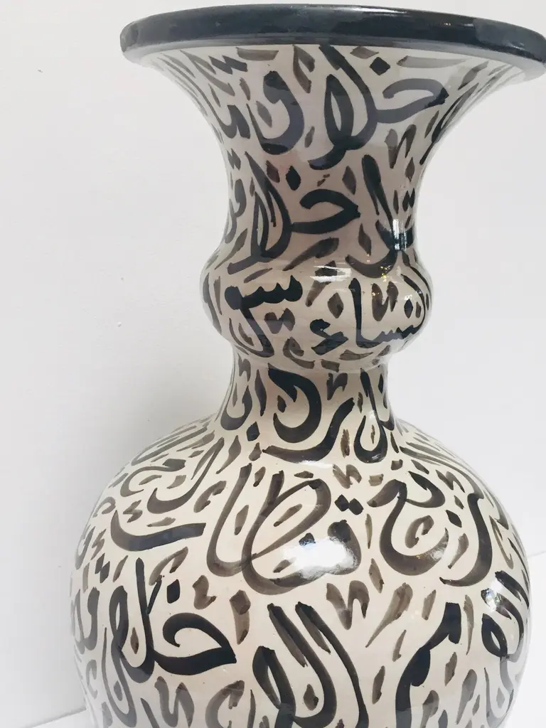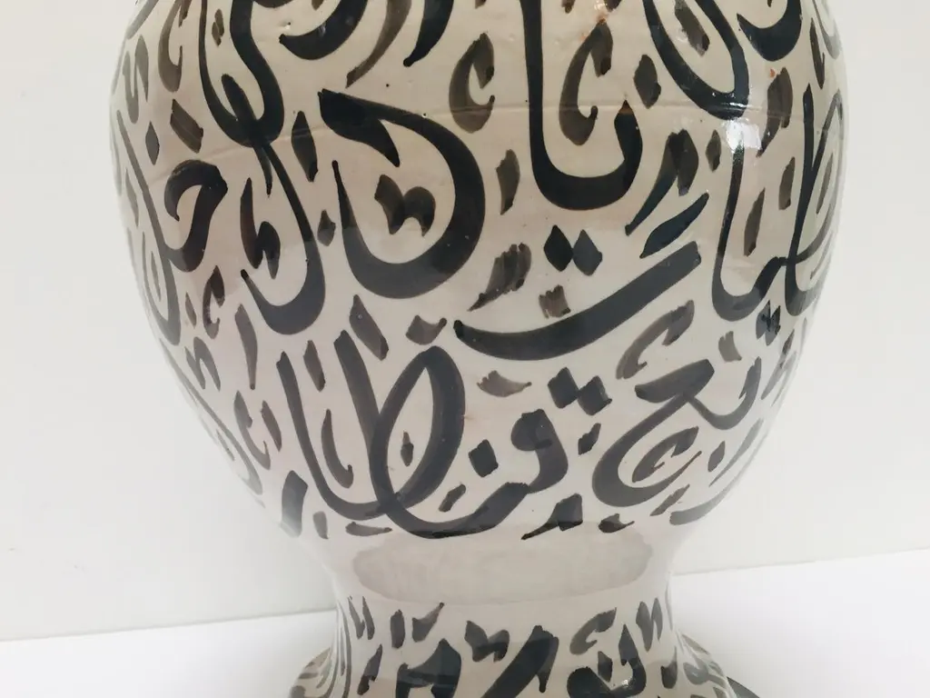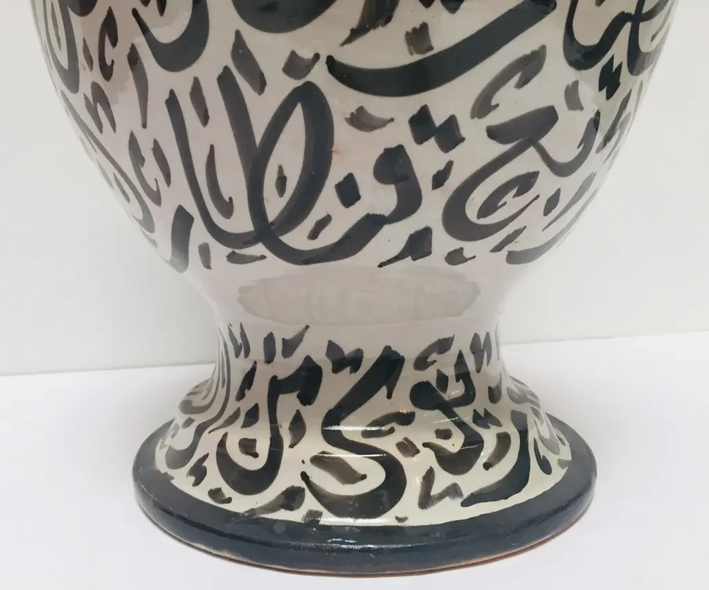 Large Moroccan glazed ceramic vase from Fez.Moorish style ceramic handcrafted and hand painted with Arabic calligraphy writing.This kind of Art Writing looks calligraphic is called Lettrism, it is a form of art that uses letters that are not supposed to mean anything, just put together as Decorative Art.Black color writing design on ivory color background.A pair is available price is for 1.Large size: 26.5in. height x 14 in. diameter.Diameter mouth opening is 10 in.