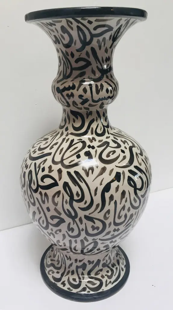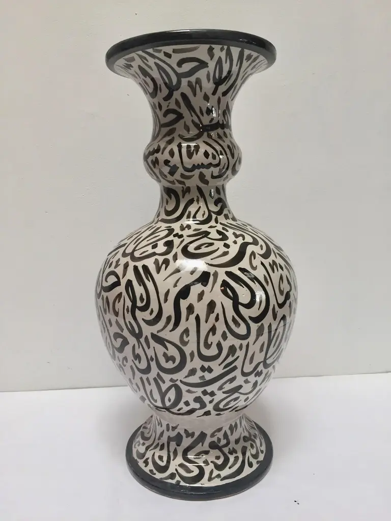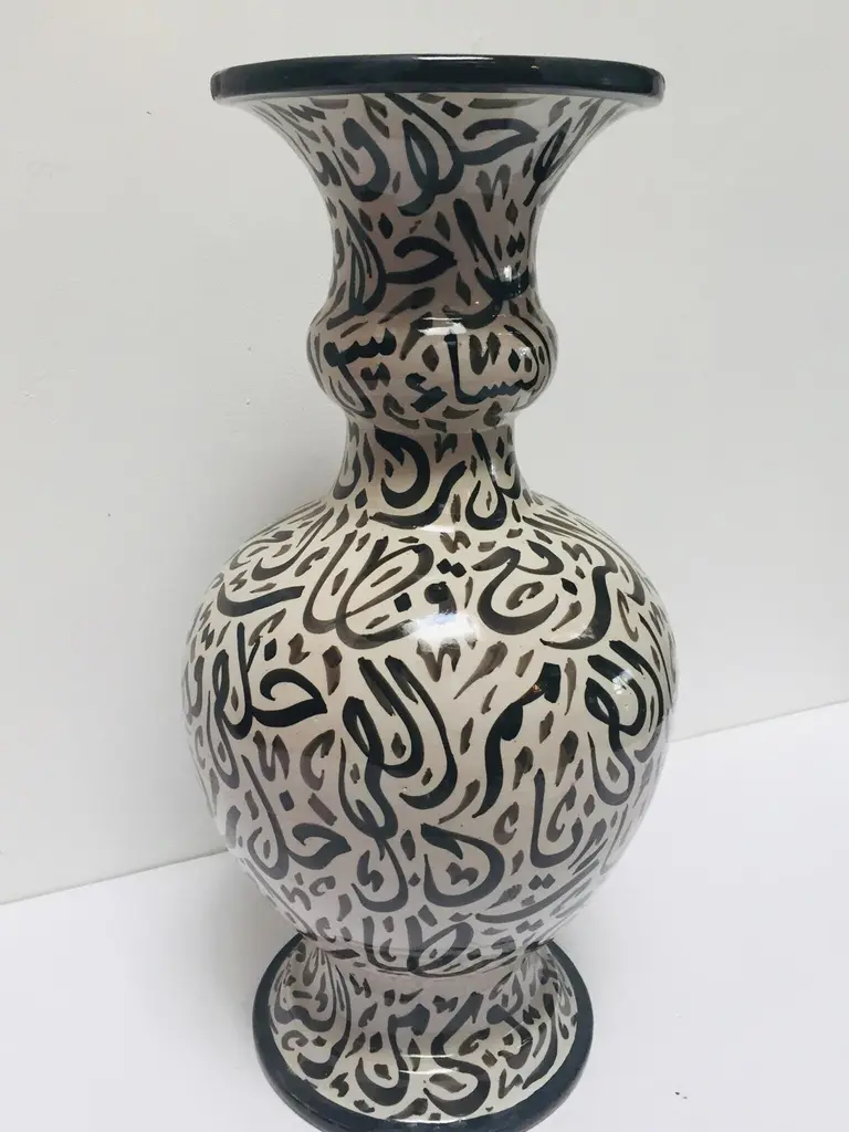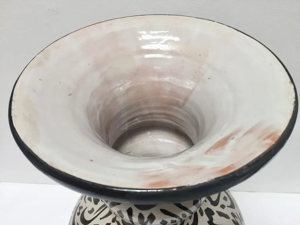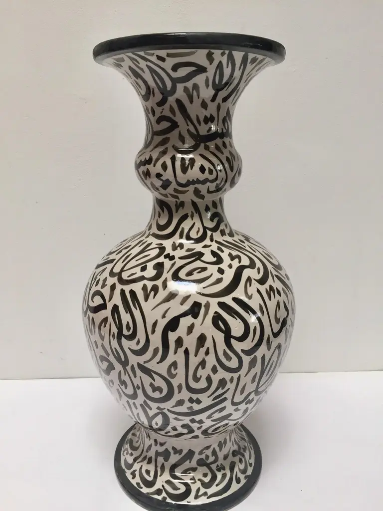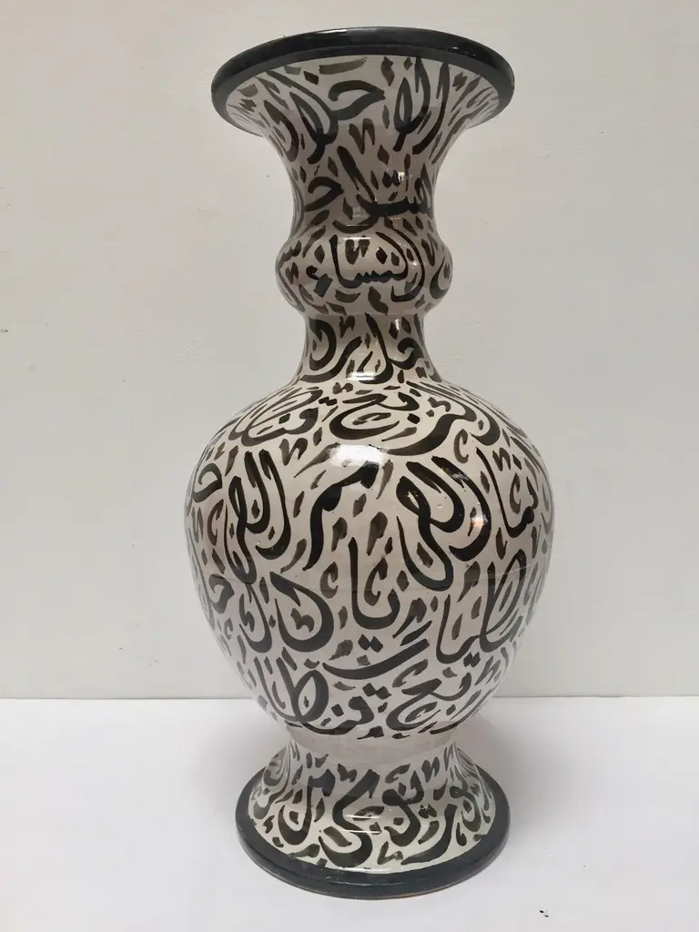 Large Moroccan glazed ceramic vase from Fez.Moorish style ceramic handcrafted and hand painted with Arabic calligraphy writing.This kind of Art Writing looks calligraphic is called Lettrism, it is a form of art that uses letters that are not supposed to mean anything, just put together as Decorative Art.Black color writing design on ivory color background.A pair is available price is for 1.Large size: 26.5in. height x 14 in. diameter.Diameter mouth opening is 10 in.