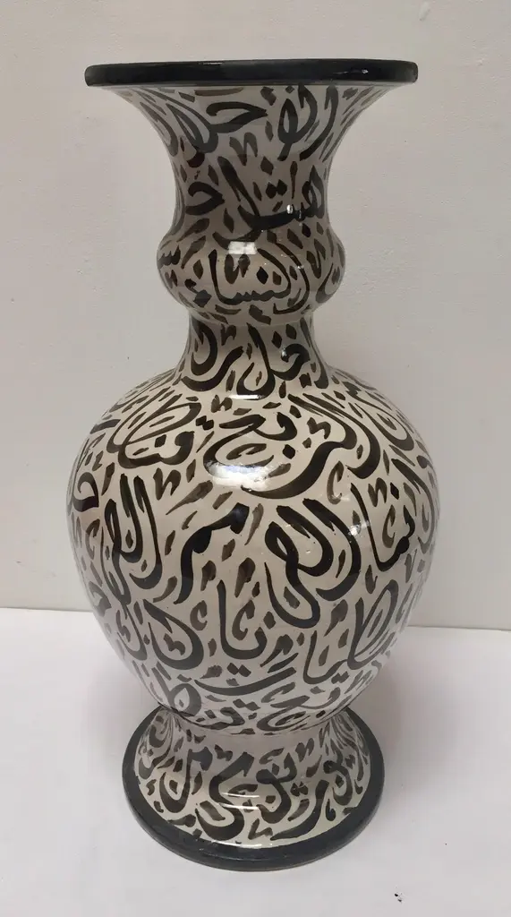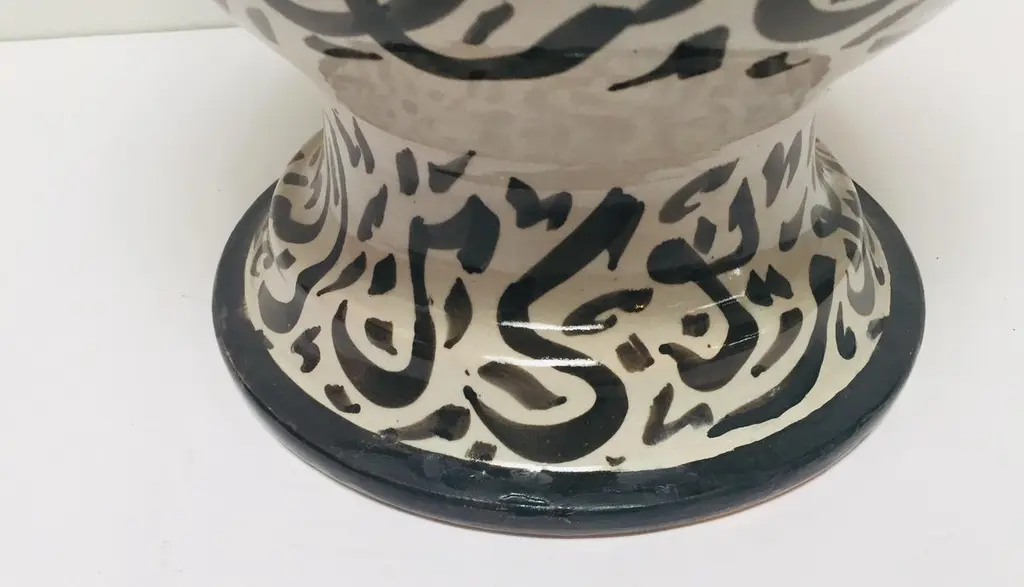 Large Moorish Glazed Ceramic Vase With Arabic Calligraphy Black Writing Fez