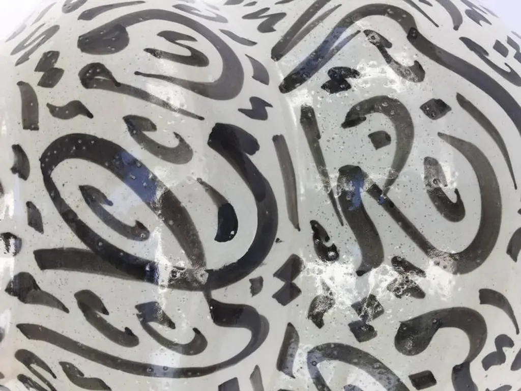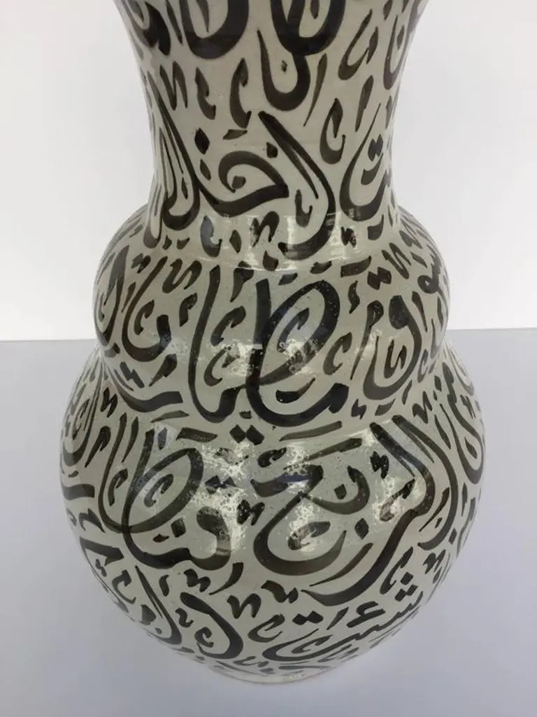 Large Moroccan glazed ceramic vase from Fez. Moorish style ceramic handcrafted and hand-painted with Arabic calligraphy writing.This kind of Art Writing looks calligraphic is called Lettrism, it is a form of art that uses letters that are not supposed to mean anything, just put together as Decorative Art.It is just about the beauty of the free writing.Brown color writing design on ivory color background.A pair is available price is for 1.Large size: 24in. H x 13 in. DiameterDiameter mouth opening is 10 in.