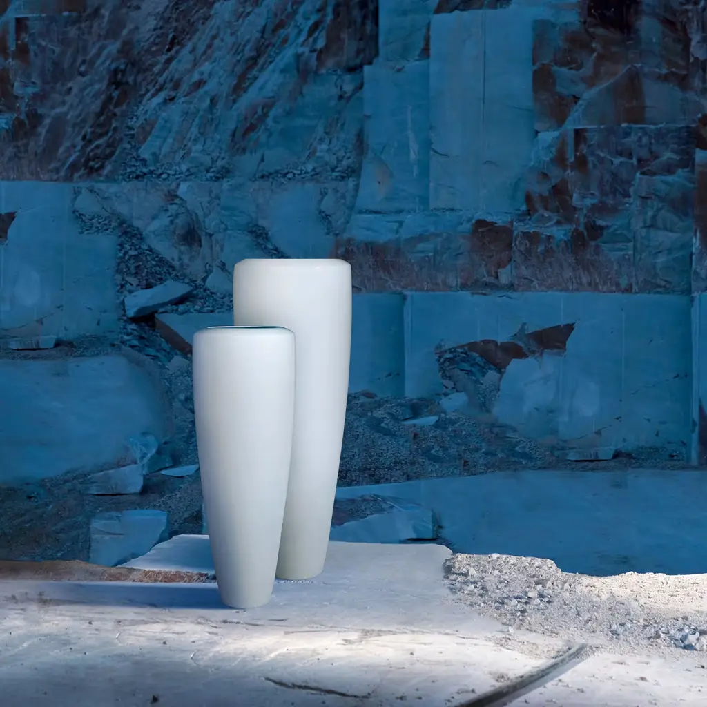 Handcrafted of LDPE (Low Density Polyethylene), a 100% recyclable and durable thermoplastic, this tall vase belongs to the Obice Collection. Ideal for indoor and outdoor use in luxury gardens, hotels, as well as lofts, the sleek, elongated silhouette has a Carrara marble finish that gives a more sophisticated look to this stunning decorative object that will make a statement either by itself or with flower arrangements.