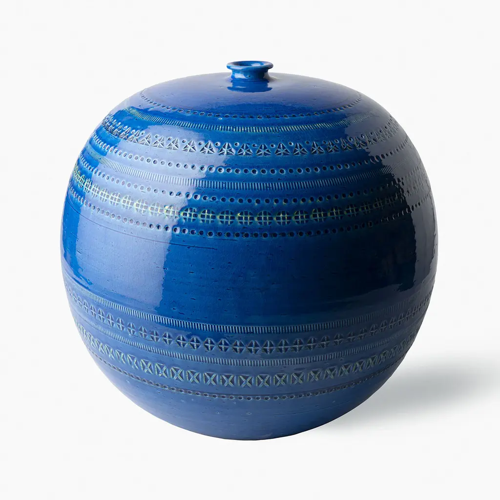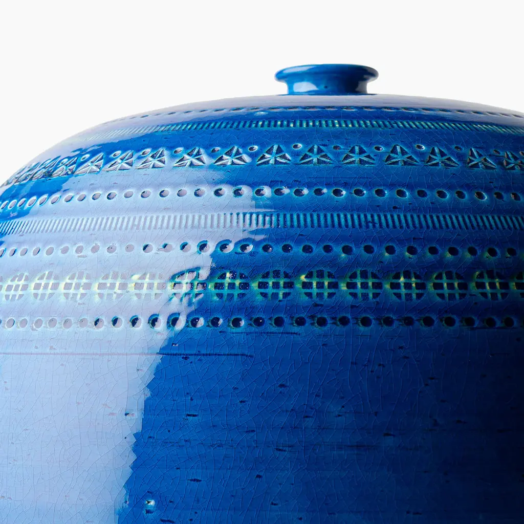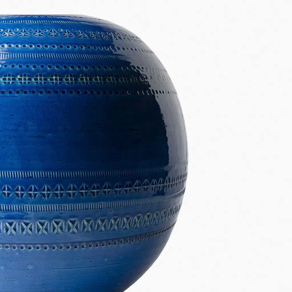 This striking vase in white clay with a turquoise finish has a simple round shape with a tiny mouth at the top. It was designed by Aldo Londi in 1953 and it is adorned with parallel carvings all around its body with the exception of a central strip left smooth, and the top area.