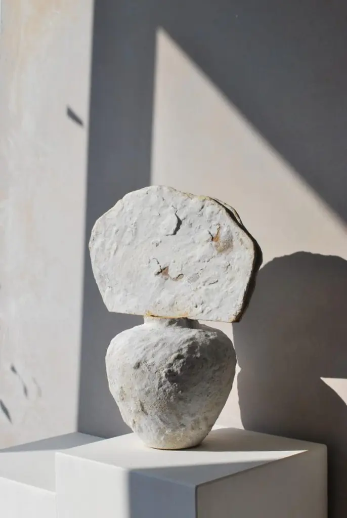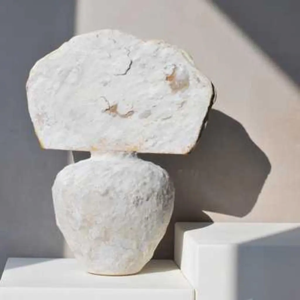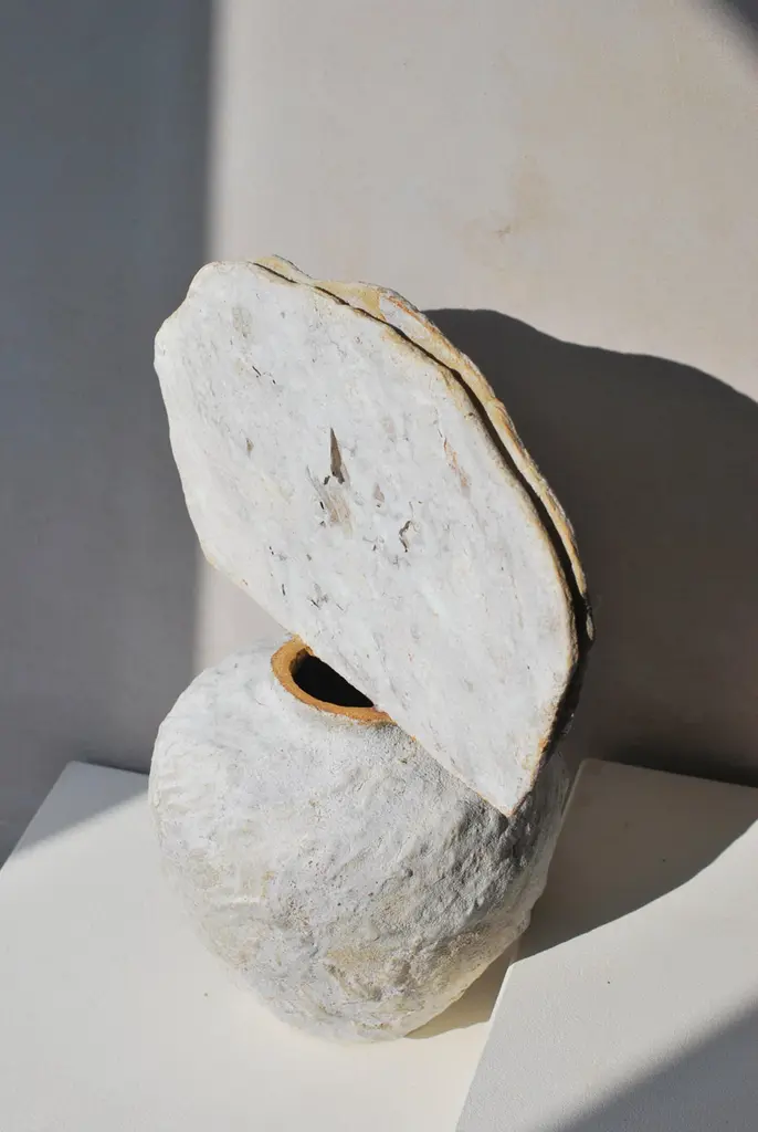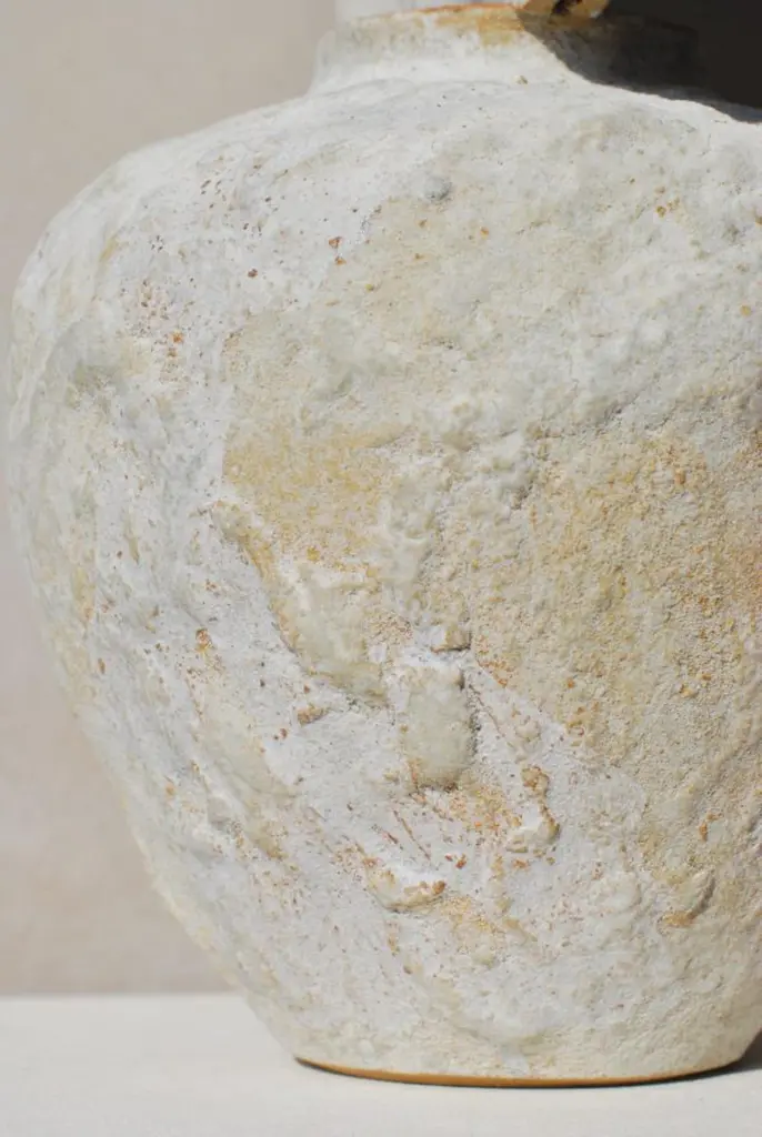 Large Sandstone Vessel Vase by Moïo StudioUnique PieceDimensions: W 32 x D 18 x H 38 cmMaterials: White glaze and porcelain on tan stonewareMoïo Studio is the Berlin-based ceramic art studio of French-Palestinian artist Maia Beyrouti. It was started in to develop a body of work investigating the role of objects that bridge art, craft, and design.With a focus on sculptural vessels and an interest in expressive surfaces, each project comes together as a result of the studio’s ongoing glaze and clay materials research.This informs a desire for certain forms and techniques inspired by architecture, raw materials, and celebrating mundane, utilitarian or overlooked details. All of the work is handmade by the artist in her studio.The practice is an ongoing exploration of the familial and spacial relationship between humans, objects, surfaces and forms.Maia as born in Paris, grew up in the South of France and moved to London as a teen in the 1990s. There, she studied at Chelsea, Camberwell College of Arts & Crafts, and LCC. She is now based in Berlin, Germany since 2009.With an eclectic background in Conservation, Historical & Cultural studies as well as visual communication, she nurtured a multi-disciplinary approach to her art, which includes painting, writing, sounds and ceramics. Her ceramic work mixes wheel-work and hand building techniques.