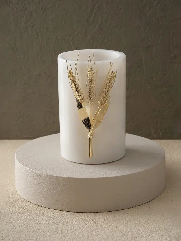 The Large White Marble Vase With Gold Wheat Motif evokes a sense of pastoral elegance with a refined, sculptural edge. Hand-carved from smooth white marble, this cylindrical vase is adorned with a detailed brass wheat motif—symbolising abundance, growth, and natural beauty. Its clean silhouette and warm metallic accent create a harmonious balance between modern minimalism and rustic charm. Whether displayed as a standalone object or used to showcase fresh or dried florals, it brings a grounded sophistication to any interior setting.