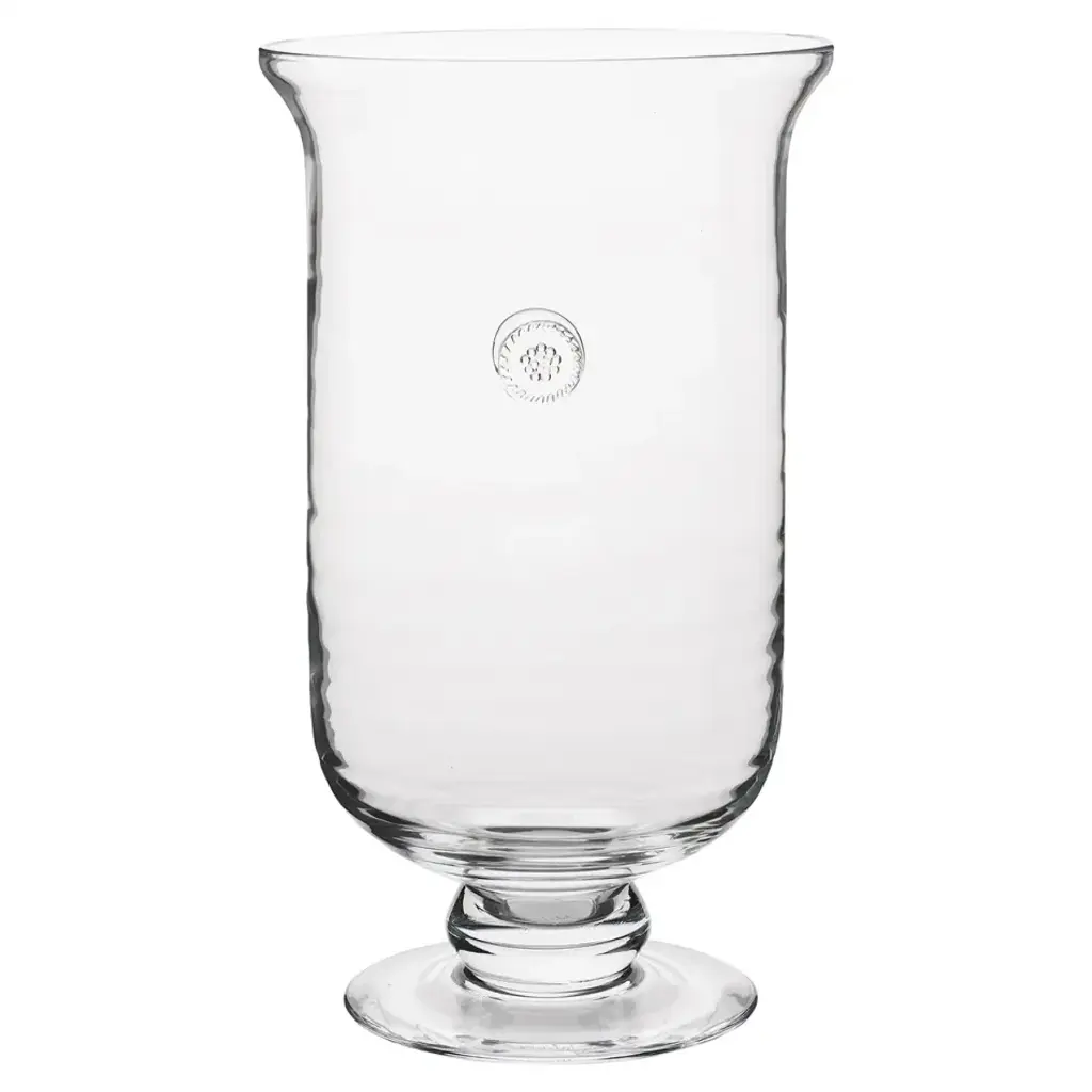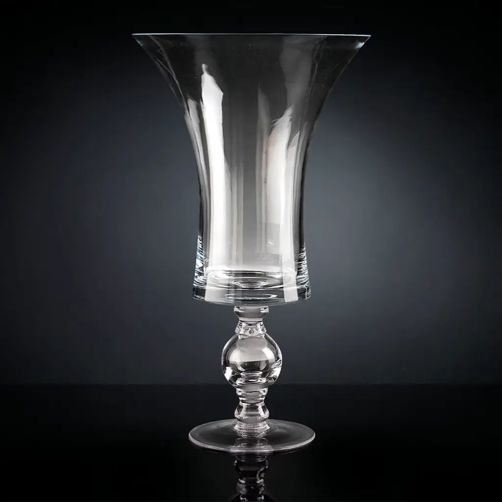 Elegant and refined, this vase showcases a sleek silhouette reminiscent of an opulent chalice. Exquisitely handcrafted of clear glass, it is composed of a round base with a short and refined stem, elegantly sustaining a tall and capacious cup with flared rims.