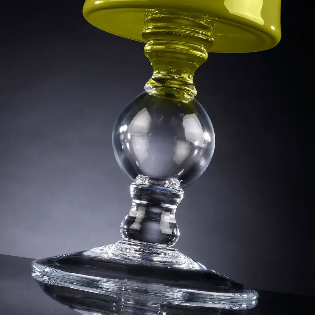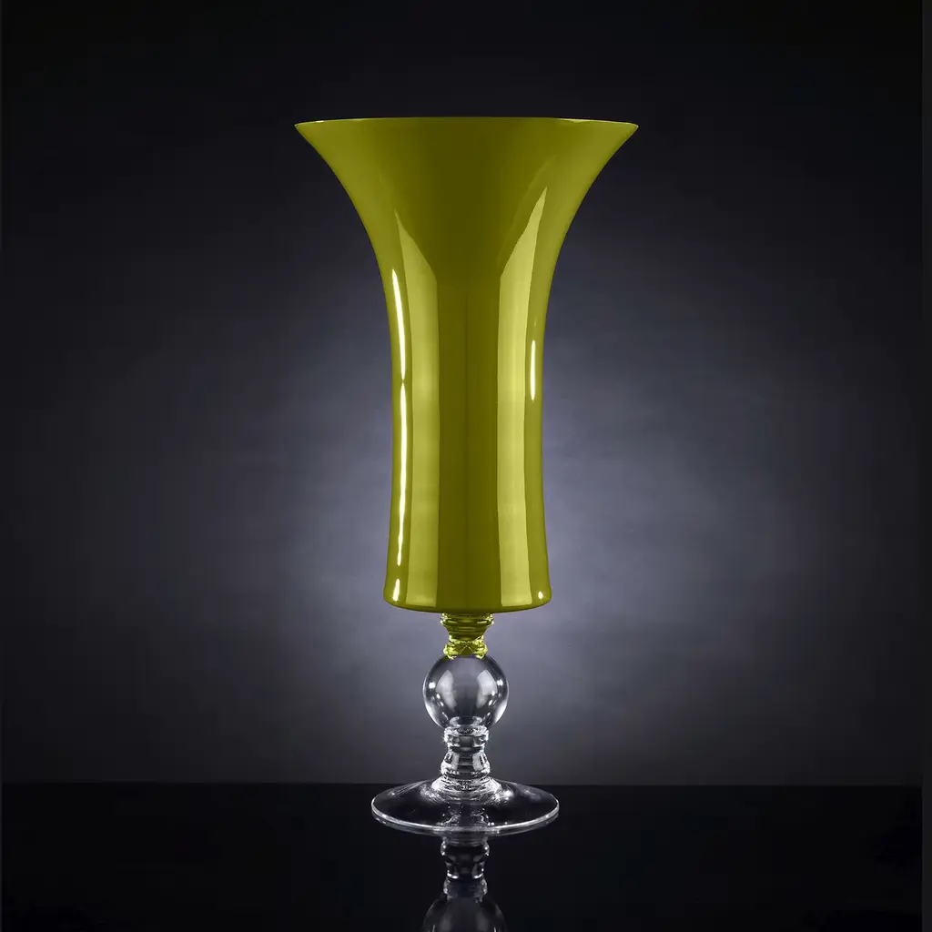 An elegant and refined addition to both a classic or modern dining table, this vase is defined by a sinuous clear glass decorative stem supporting an apple green body flaunting a flared top. Masterfully handcrafted by expert hands, it will make a statement on its own as well as paired with the other pieces from the Laura Chalice Collection.