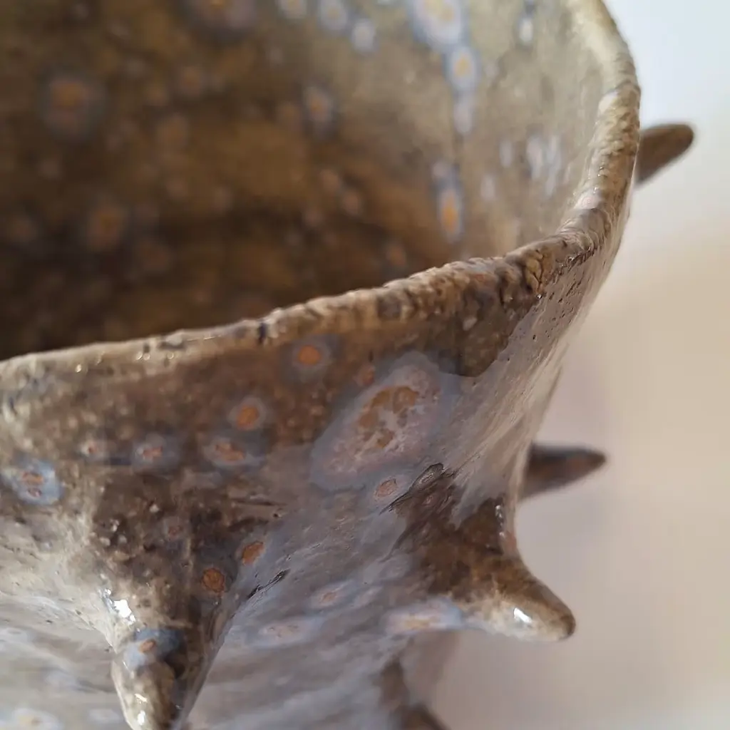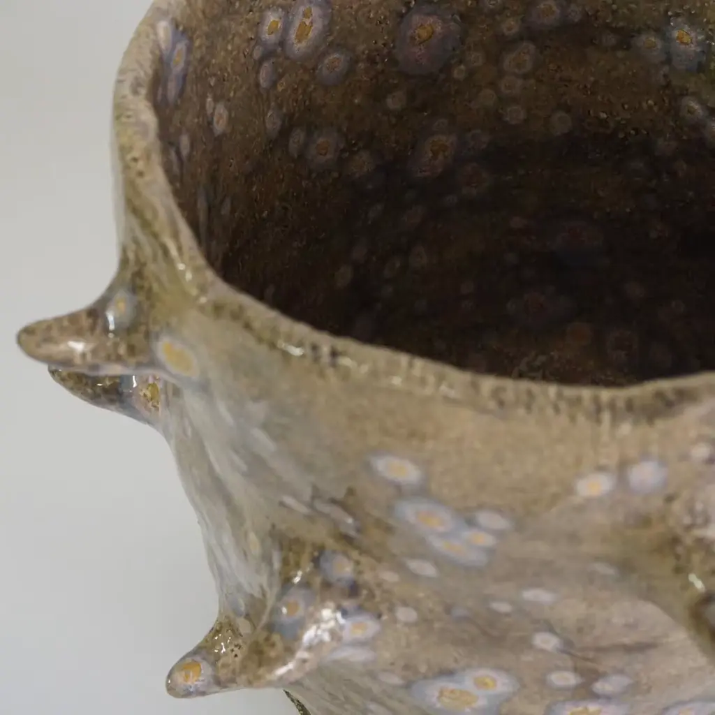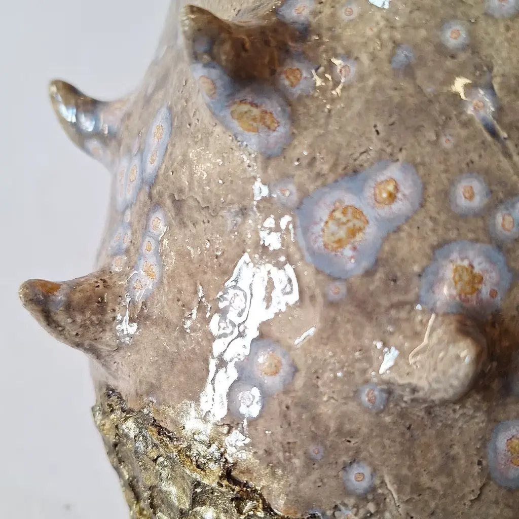 Flaunting a deliberately irregular design distinguished by pointy protuberances almost recreating crystallized flames, this vase aptly belongs to the Lava Collection. Different etched detailing further add to the general textural dynamism, while a lively gray-and-golden mottled motif stands against the green-toned glazed surface. An ode to natural shapes, each vase is handmade and unique.