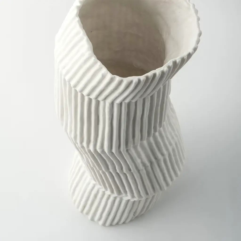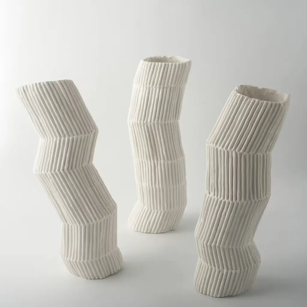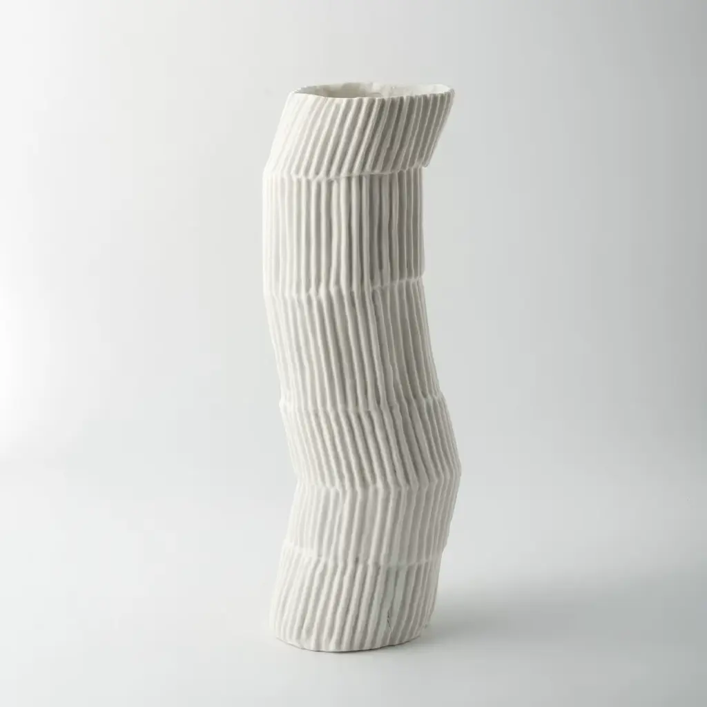 The "Le Torrette" sculpture vase by Nino Basso is a stunning representation of modern artistry. Characterized by its asymmetrical form and textured white surface, the vase features deliberate grooves that highlight its raw, unpolished finish. Crafted from porcelain and paper clay—an innovative blend of natural fibers—this vase is a one-of-a-kind. Its captivating tilt adds to its uniqueness, making it a superb addition to contemporary interiors.