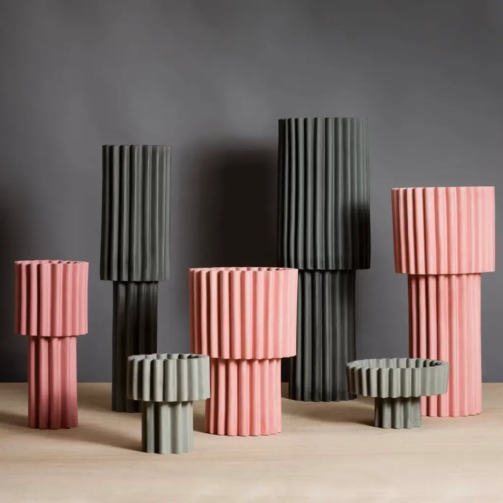 A stylish focal point on a bookshelf or console table, this original ceramic vase belongs to the Le Torri Collection born as a vertical variant of the previous Flessi Collection. Showcasing a tall silhouette with two stacked cylindrical shapes and an eye-catching fluted surface, this vase boasts a matte gray finish to reinforce its architectural inspiration from which the collection takes its name ("torri" meaning towers).