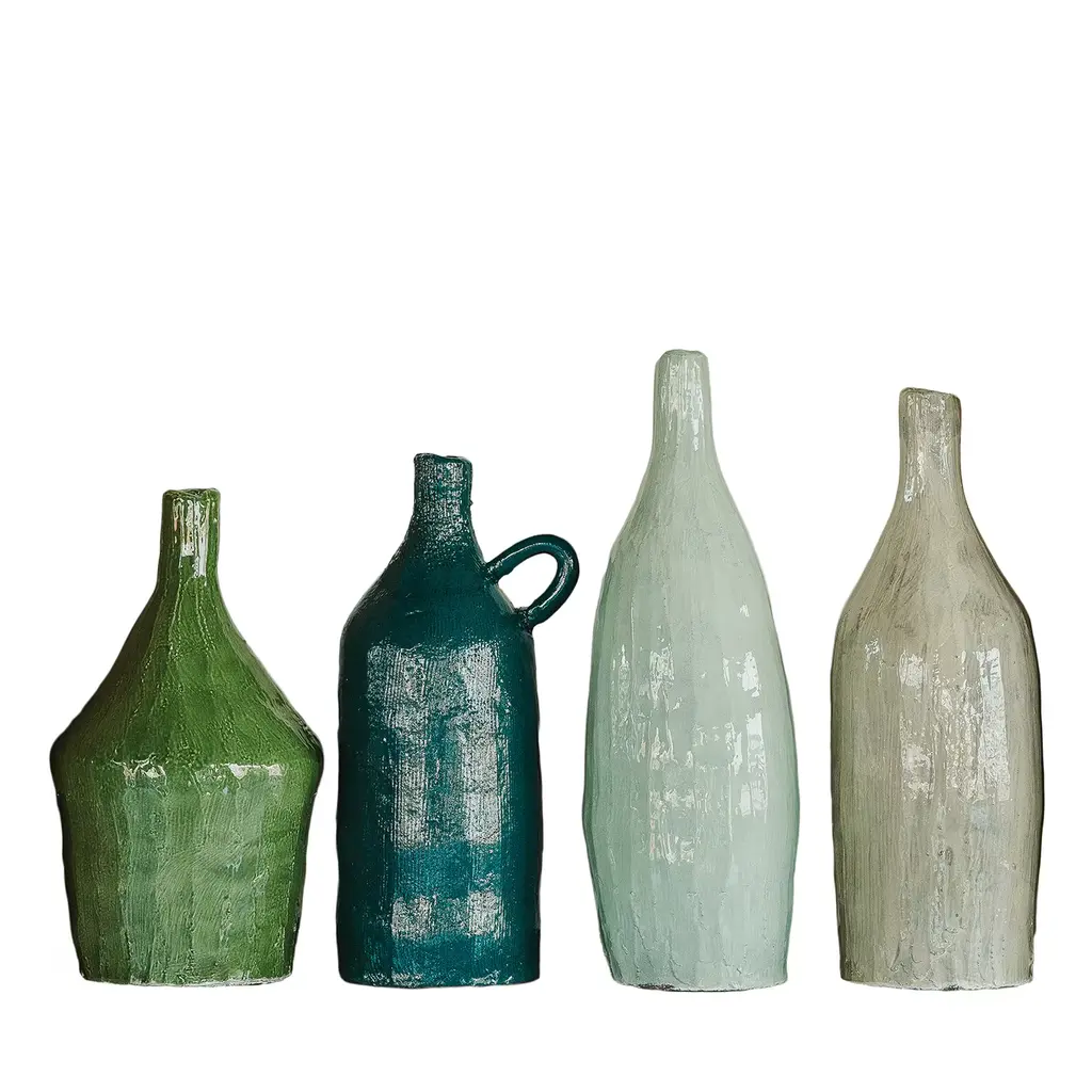 The artistic finish on this set of two peacock blue vases captures an iridescent glow for added drama.