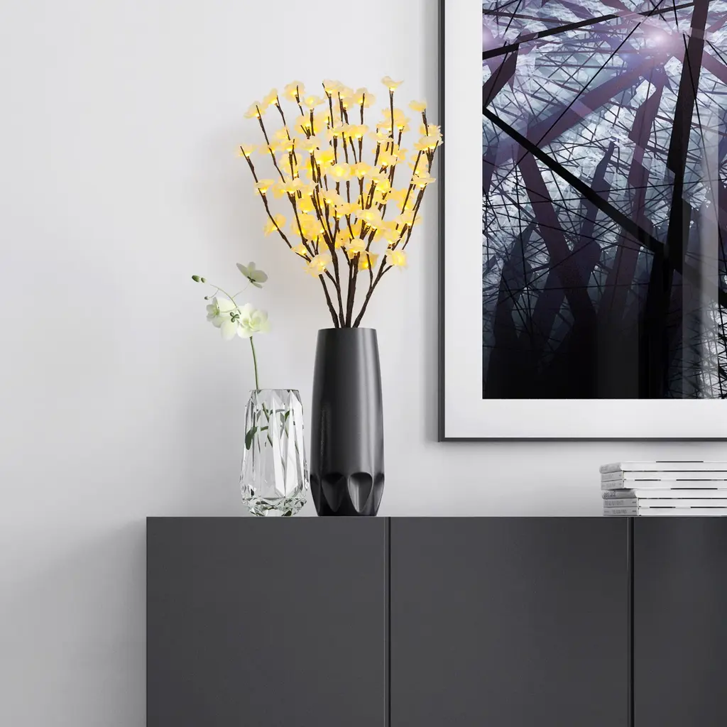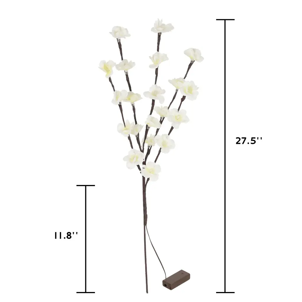 The lights are made of high quality copper wire and has flexible branches that are accented with warm white lights each set.Specification - Each pack of decorative twig lights comes with bendable stemsSafe and Easy Use - Battery Operated for safe and easy use, 2pcs AA battery (NOT included) required, 3V input voltage, completely safe for operation.DIY your Twig Light: This lighted branches are bendable,you can make them twist, or pull them up and down to create your own natural look.Ideal decoration for vase on chest of drawers, bedside table, floor, living room, bedroom, children room, corridor, exhibition, shop, supermarket, cafe, hotel, hallway, room in everyday life or at parties such as Valentine's Day, Christmas, birthday, engagement, wedding, party.NOTE: The twig light need work with a vase or some other base. The vase & flowers shown in the picture are NOT included, please purchase yourself.NOTICE: Because the flower is inserted directly into the lamp, the flower may come off when you receive it, please insert the flower directly back into the lamp head. Thank you for your understanding.