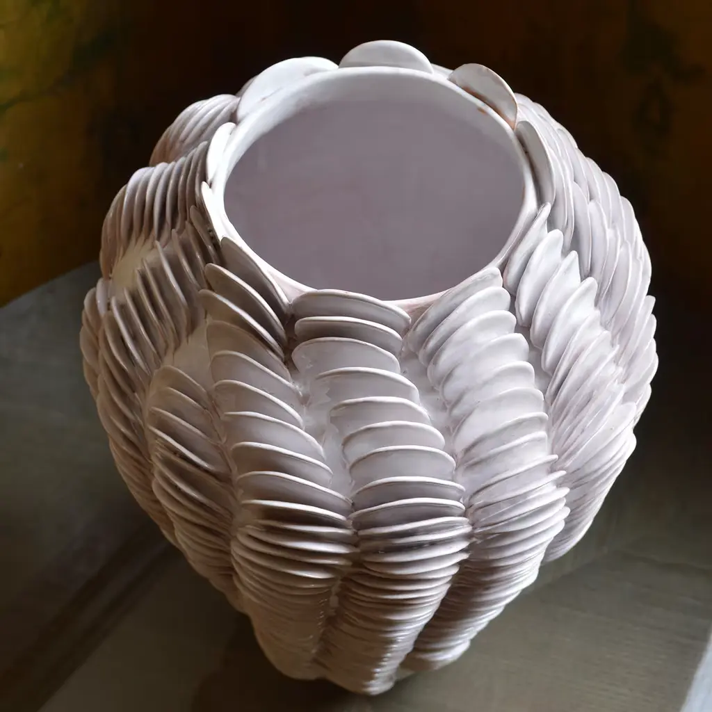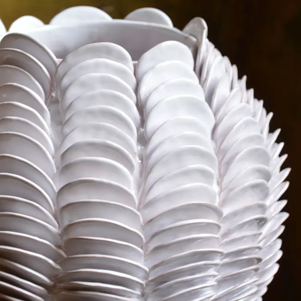 This stunning decorative vase is a work of art entirely crafted by hand of terra-cotta with the "colombino" technique, without the help of mechanical tools or molds. Unique and organic, the stunning texture is reminiscent of fish scales, while the name comes from the ancient Greek word for white, "leukos", to hint at the pure shade of this exquisite artifact, which boasts an enamel finish and was fired twice in the kiln. Each piece is numbered and signed by the artist and any variations in colors and measurements is the result of the traditional artisanal methods used by the artist.