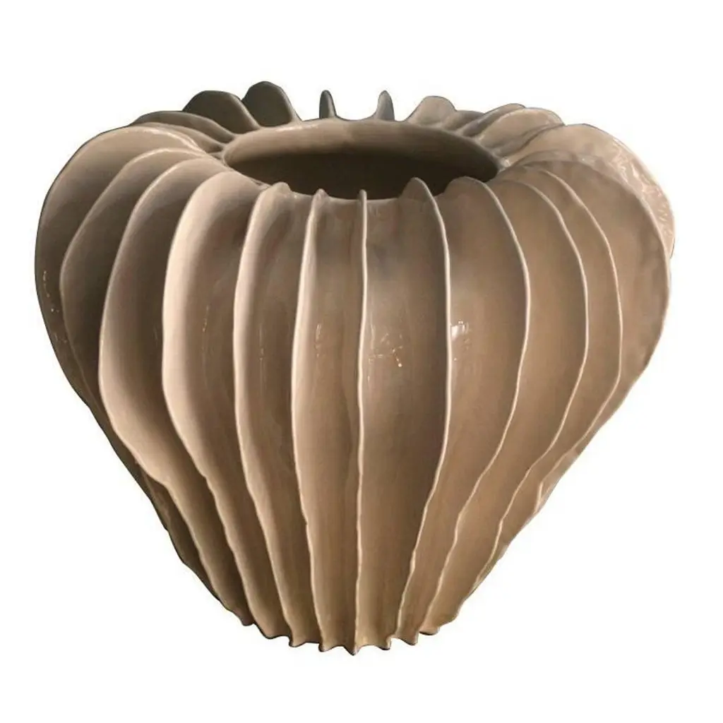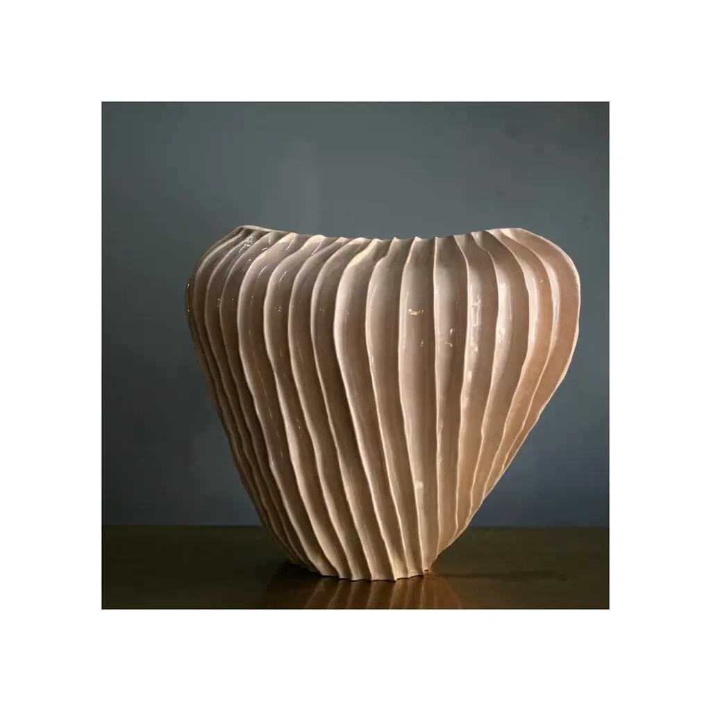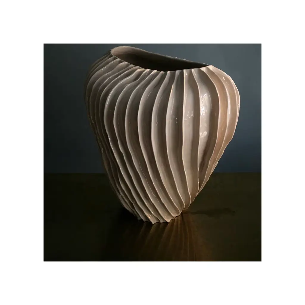 The distinct feature of pieces made with colombino technique is their uniqueness and high aesthetic value. The blush pink glossy glaze obtained during a two-step firing process adds texture to this intriguing vase that features a unique pattern of vertical strips that run slightly diagonally from the base to the top. Each piece is signed and numbered and the slight variations in size, shape, and finish are the marks of a unique handcrafted piece. \n