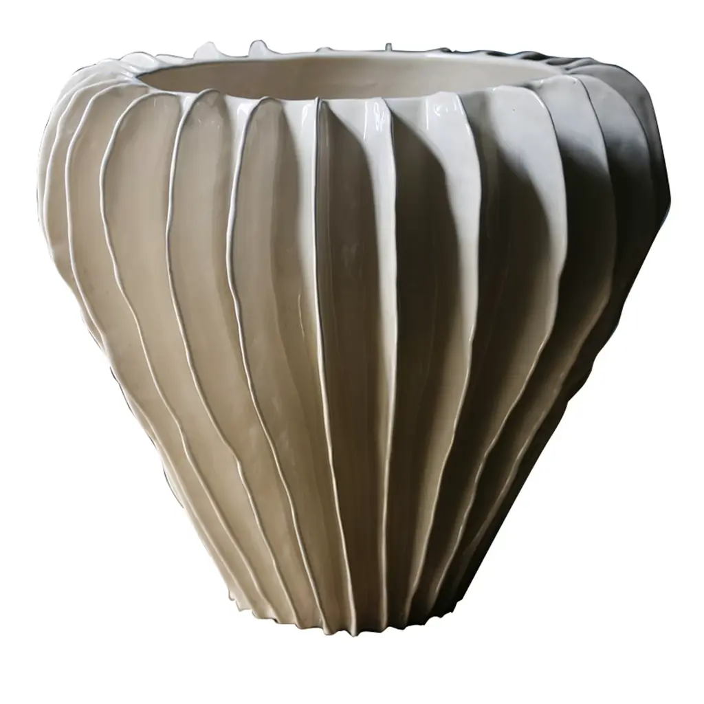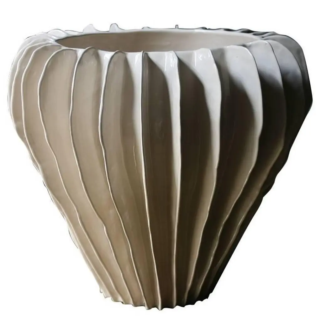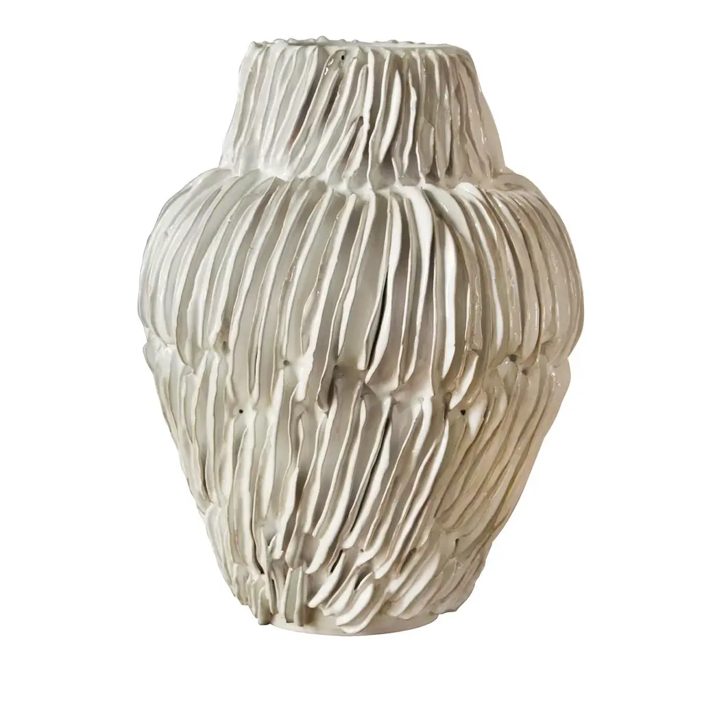 The distinct feature of pieces made with colombino technique is their uniqueness and high aesthetic value. The blush pink glossy glaze obtained during a two-step firing process adds texture to this intriguing vase that features a unique pattern of vertical strips that run slightly diagonally from the base to the top. Each piece is signed and numbered and the slight variations in size, shape, and finish are the marks of a unique handcrafted piece. \n