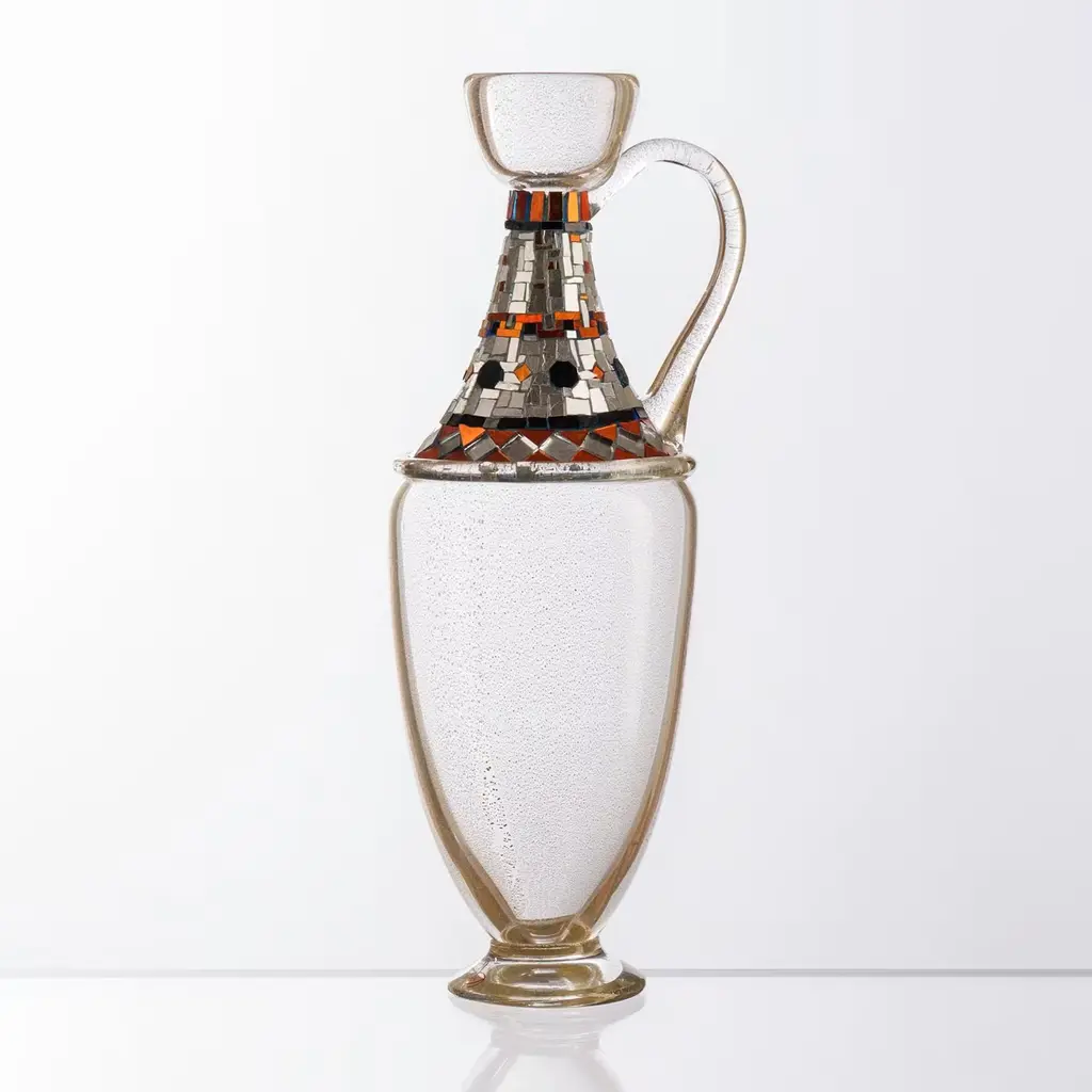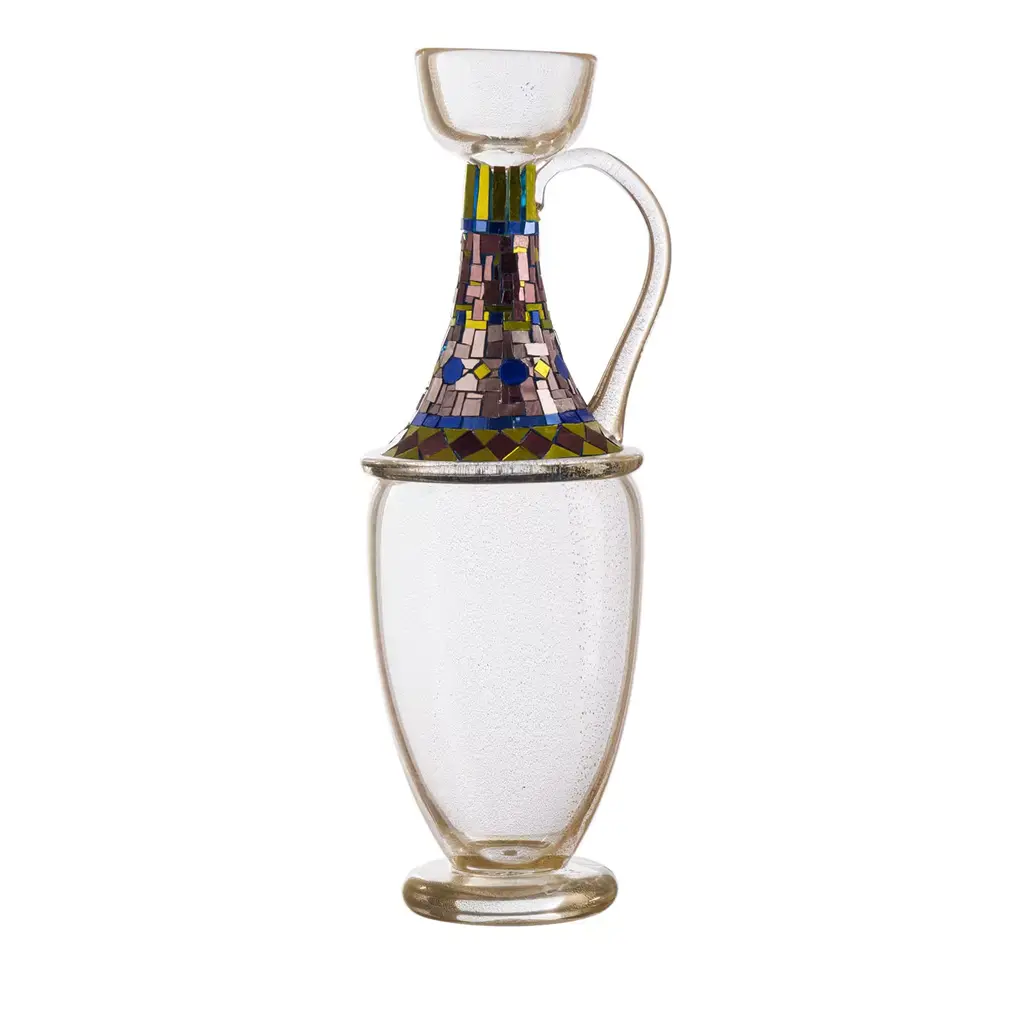 Inspired by ancient Greek art, and more specifically by the famous Lekythos vases of the fifth century BC, this unique vase is part of the Art Collection. Handcrafted in Murano by master glassblowers using gold and crystal mouth-blown glass, the mosaic is subsequently applied around the neck of the amphora-shaped vase using 24 kt gold tesserae with colored glass in Spilimbergo, known as the town of mosaic. A precious interpretation of ancient art in contemporary style that will enrich any décor with timeless allure.