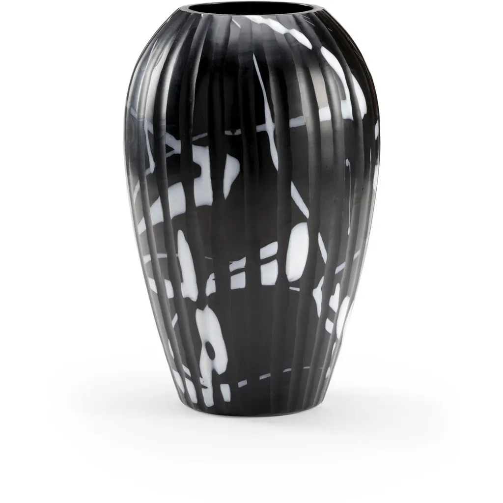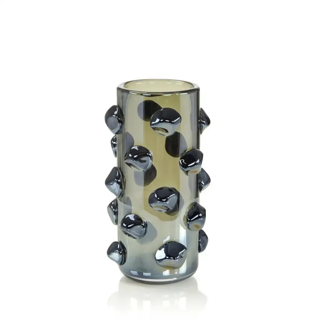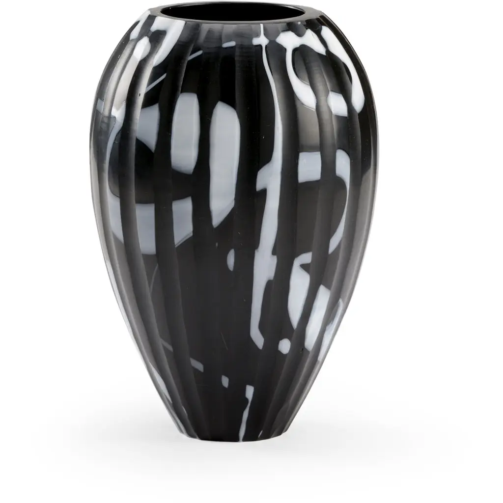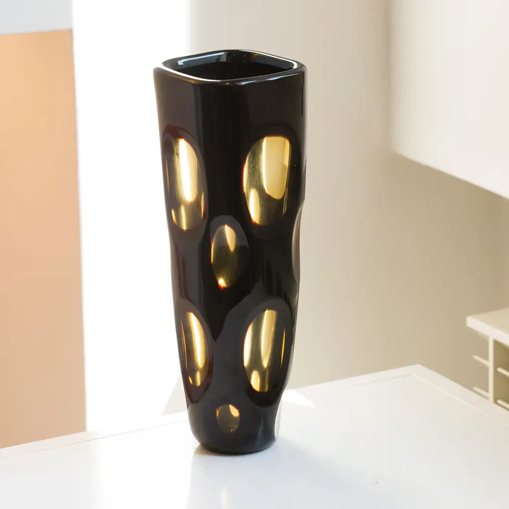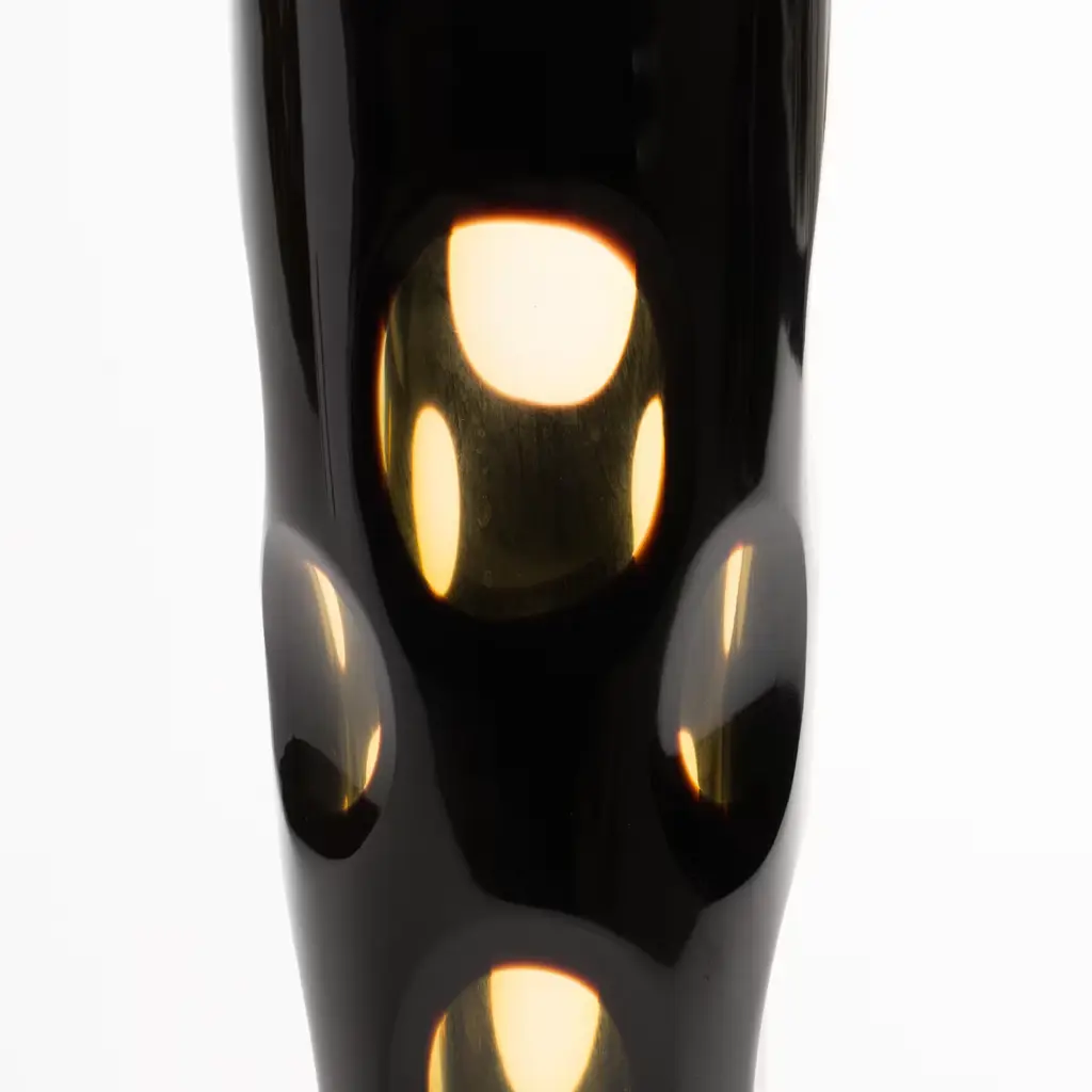 This exquisite mouth-blown vase is hand crafted while hot and then while cold to achieve the distinctive spotted exterior in black and amber colors highlighting the unique shape of this piece.