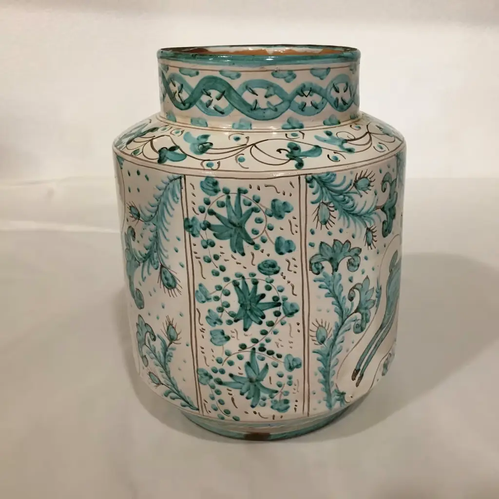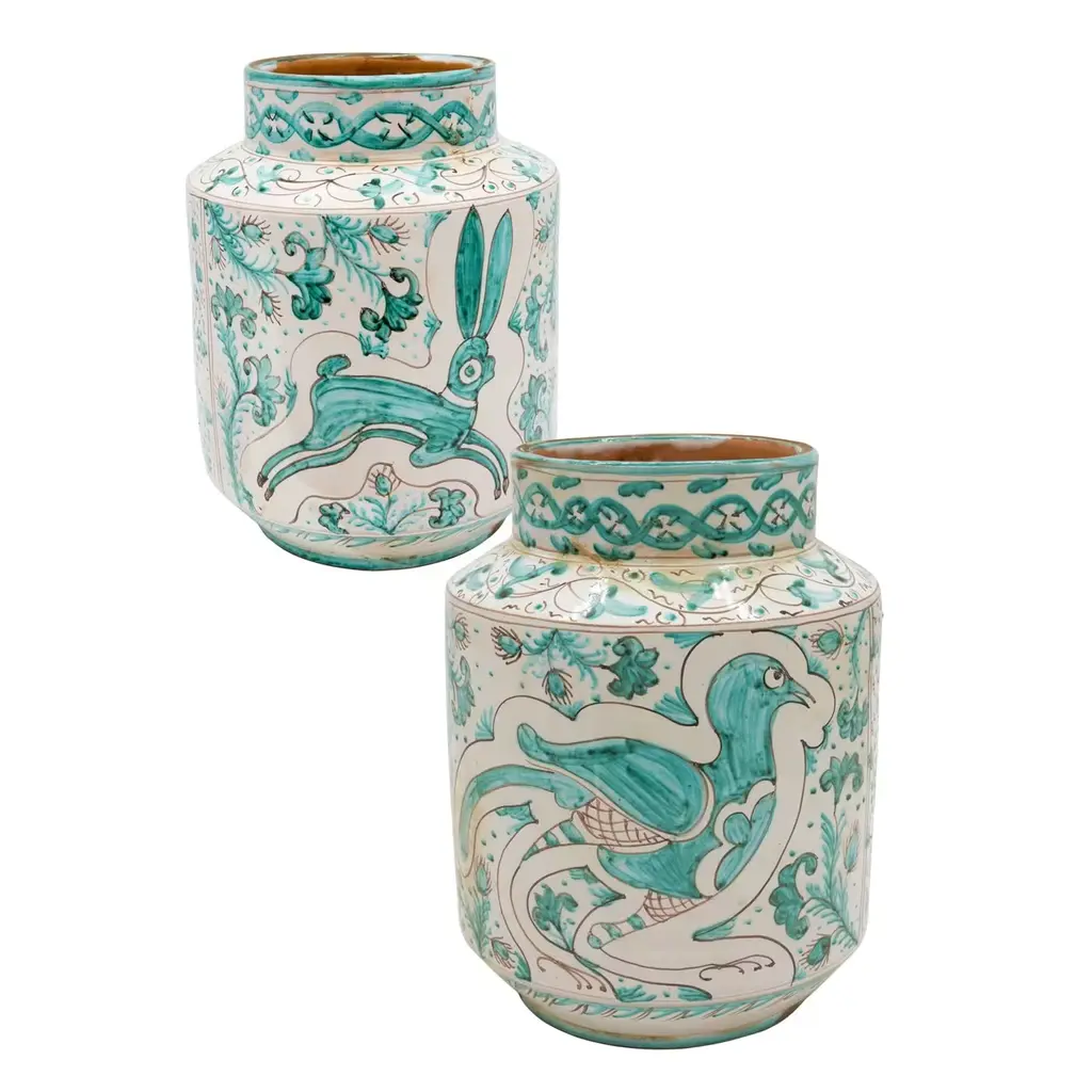 The classic shape of this vase was inspired by the late-medieval period and the jars used in pharmacies. Enhanced by traditional colors with a refined antique patina, this piece exudes timeless charm. The hand-painted decoration features a hare captured mid-race, surrounded by stylized leaves and flowers. The ancient Tuscan workmanship used in its creation makes it a truly exceptional piece of functional home decor. Due to the artisanal techniques used in the production process, each piece may differ slightly, with natural variations that should not be considered flaws.
