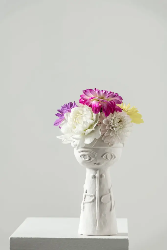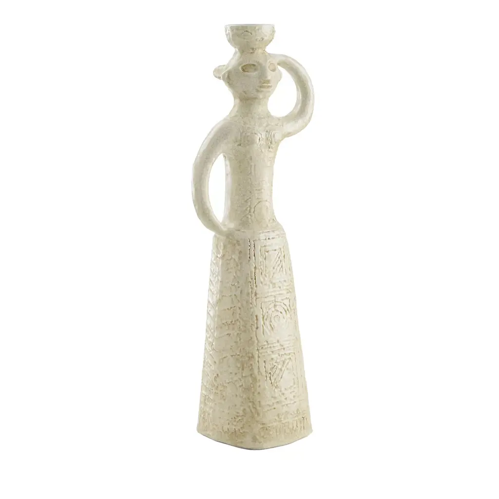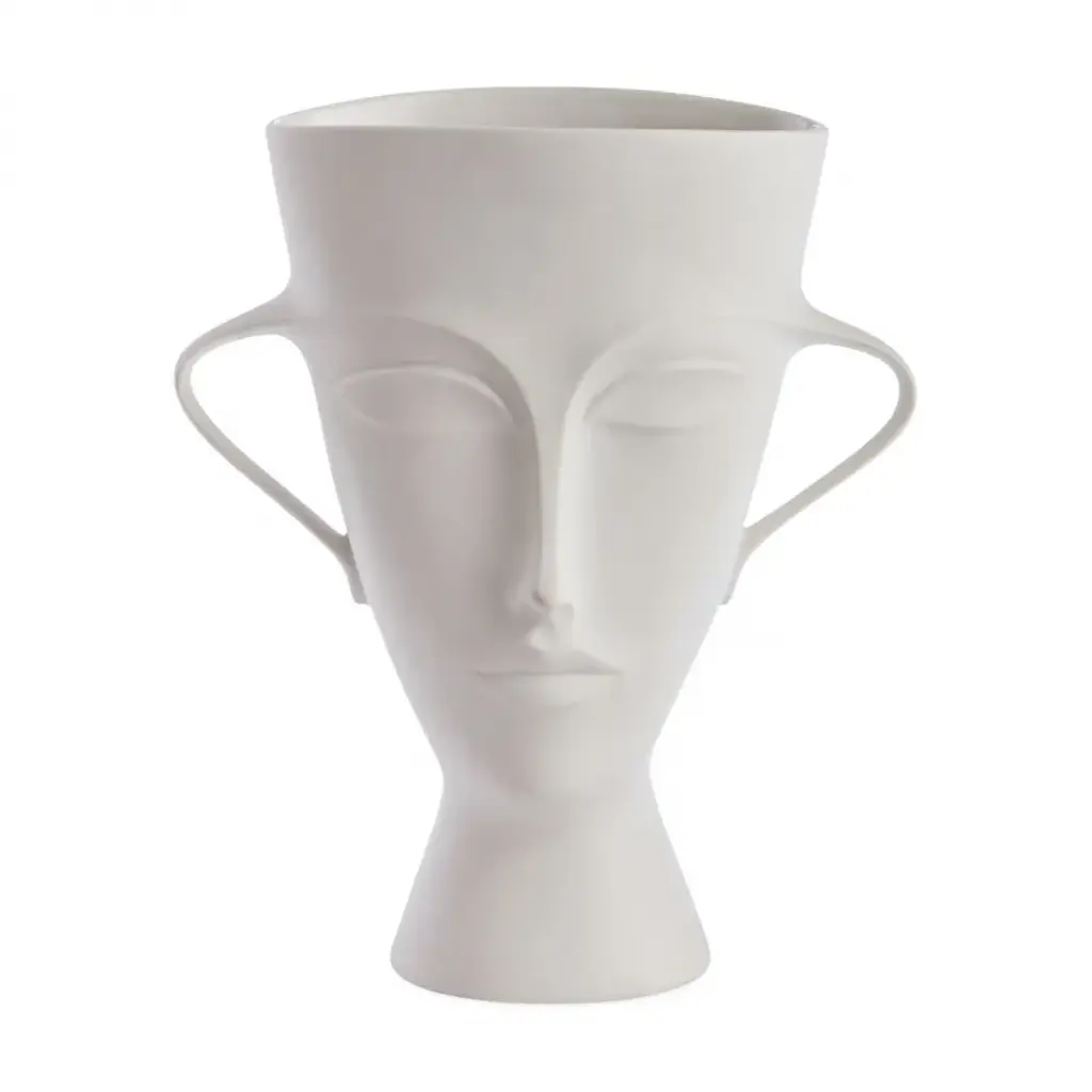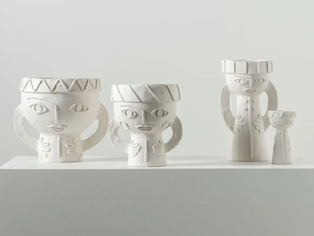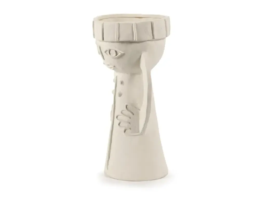 Les Femmes is a round vase made of stoenware.The distinctive style of Marie Michielssen emphasises the women's hands and eyes in the design of this white vase. The refined details on the women's headdresses and clothing contrast with the rougher aspect of the chamotte clay. The vases' inside and bottom are covered with a transparent matte glaze.The white vase shows Marie Michielsson's creative vision by focusing on the hands and eyes of the women in the design. With an eye for detail, the women's headdresses and clothing are finely finished. A transparent matte glaze protects and beautifies the inside and bottom of the vases.Eclectic, a world full of wonderful extremes based on a well-thought-out structure. That is the first thing that comes to mind for the accessories collection of Marie Michielssen. Serax ’s resident designer likes variety, both in style and in her use of materials and colours. From papier-mâché through concrete to porcelain, cheerfully coloured or in muted natural colours, inspired by constructivism or by the earth in its most rudimentary form, each collection is completely different.