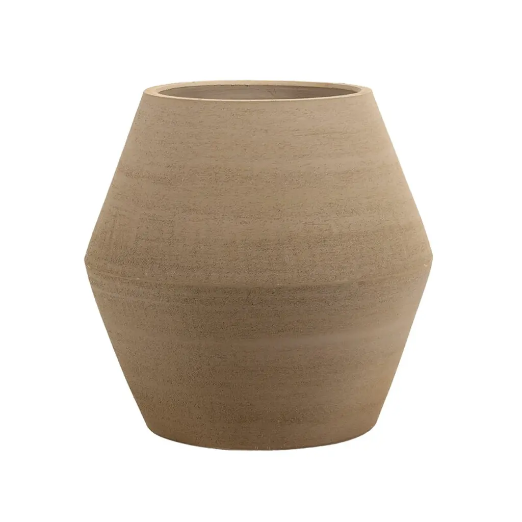 Thrown and glazed by master potters, simple terracotta is transformed into a large-scale matte black terracotta vase. Striped texture in the terra cotta adds a bit of depth to the display. Finished in matte black with subtle white speckling, round vessel beautifully presents bouquets and dried botanicals. CB2 exclusive.