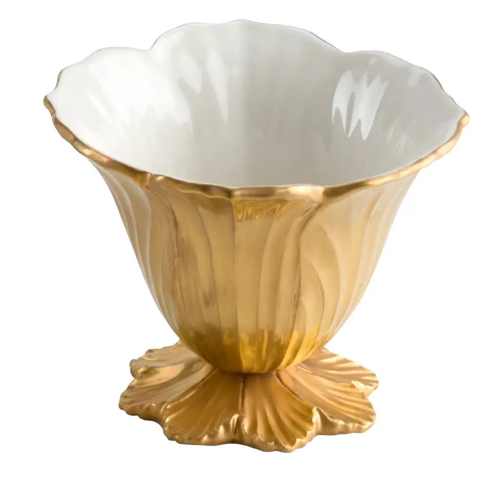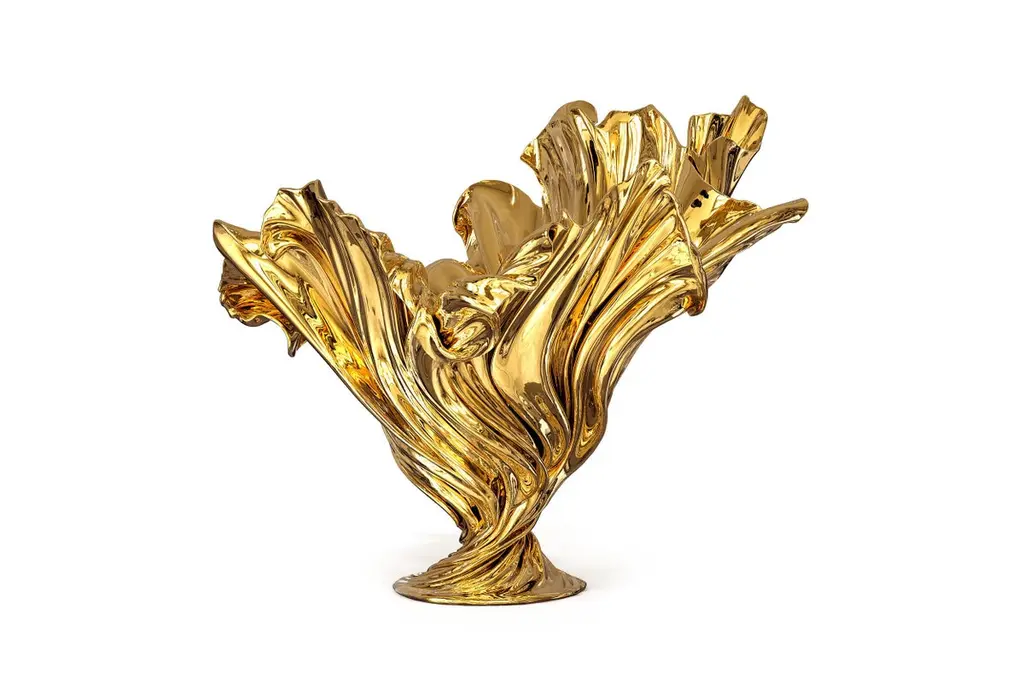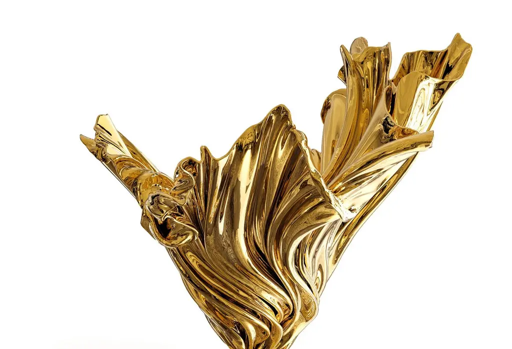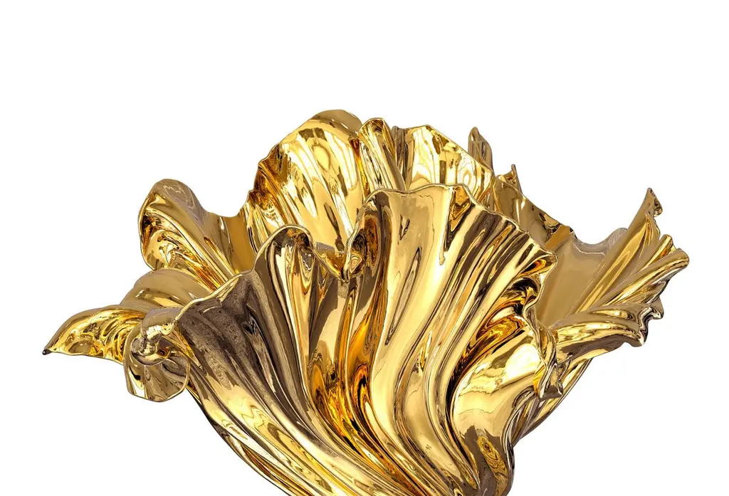 Flora Vase from Katz Studio's Levitaz collection is a captivating fusion of organic forms, simultaneously evoking the grace of a blossoming flower and the fluidity of draped fabric. This sculptural vessel, masterfully crafted in polished bronze, captures a moment of dual transformation - petals unfurling and textiles in motion - frozen in perpetual bloom.The piece is expertly cast in bronze, showcasing Katz Studio's mastery of advanced metalworking techniques. This process allows for the creation of complex, undulating forms that seamlessly blend floral and fabric-like elements with remarkable detail and precision. The result is a harmonious interplay of curves and folds, each catching and reflecting light to create a dynamic visual experience from every angle.Aesthetically, Flora Vase achieves a delicate balance between representation and abstraction. Its exaggerated proportions and stylized shape elevate it beyond literal interpretation, while still clearly referencing both botanical and textile inspirations. The warm, golden hue of the polished bronze infuses the piece with a sense of luxury and timelessness, its gleaming surface inviting both visual and tactile exploration.Conceptually, Flora Vase can be seen as a meditation on the interplay between nature and artifice, growth and movement. It captures the ephemeral beauty of a flower in bloom and the kinetic energy of billowing fabric, rendering both in enduring bronze. This juxtaposition invites contemplation on the relationship between the fleeting and the eternal in both natural and man-made realms.Within the context of Katz Studio's Levitaz collection, Flora Vase exemplifies the artist's ongoing exploration of organic, flowing forms. It showcases the studio's ability to seamlessly merge disparate inspirations - in this case, floral elements and draped textiles - into cohesive and visually striking sculptural works.As with many of Katz Studio's creations, Flora Vase may be available in various finishes, allowing collectors to tailor this iconic piece to their specific aesthetic preferences and environments.