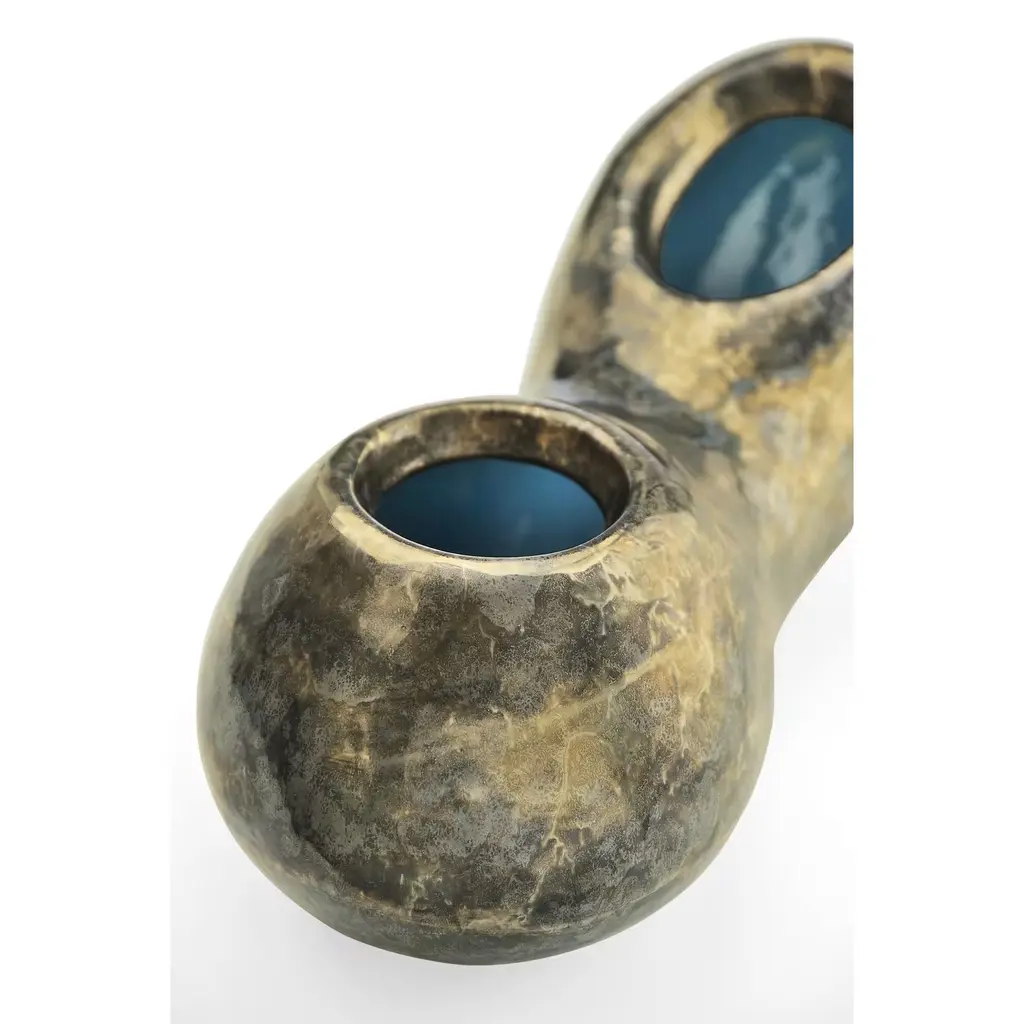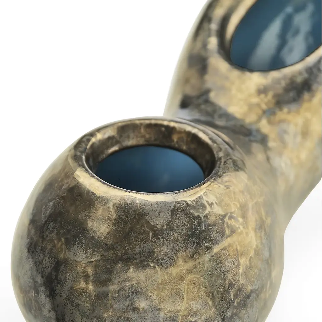 Inspired by the geological formations of rocks in caves, this striking vase evokes the majesty of nature through the use of ceramic that was glazed with two colors: a streaked bronzed gold for the exterior, featuring two round elements with a vase each, and a solid white for the inside of each vase. Entirely crafted by hand, this precious object will enrich the decor of any room in the house.