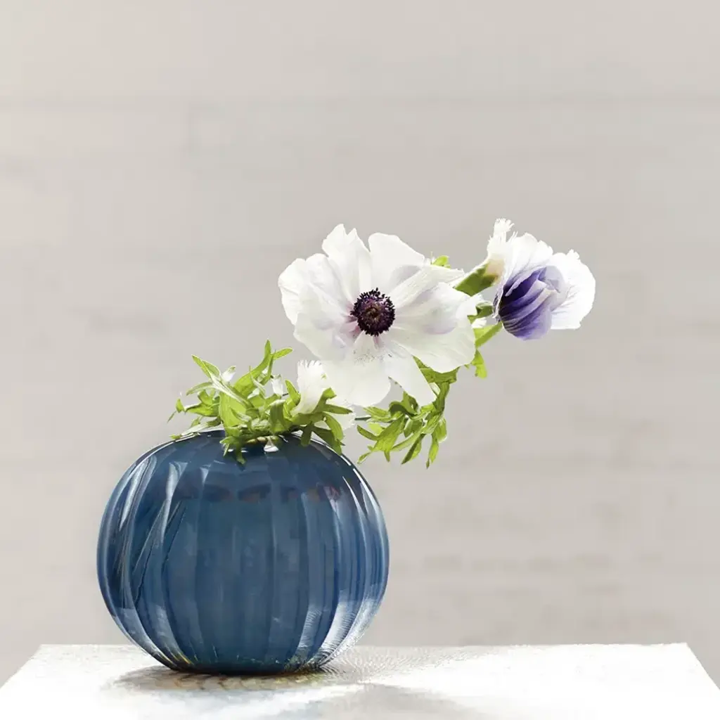 With a shimmering opalescence akin to that of a precious pearl, the Lida Vase is a splendid gem for your tabletop or console. Its rounded spherical shape is achieved through a process of hand-blowing fired glass, a traditional techniqueVilla & House’s artisans have kept alive. Its form is encircled by a gourd-like pattern of hand-cut vertical lines, a striking detail which helps add dimension and elongate its shape. The outer glass layer is finished off and perfected with a glossy glaze, underscoring its iridescent look and cool tones of smokey indigo. Whether filled with stems or displayed on its own, the Lida is a unique accent with handmade appeal.