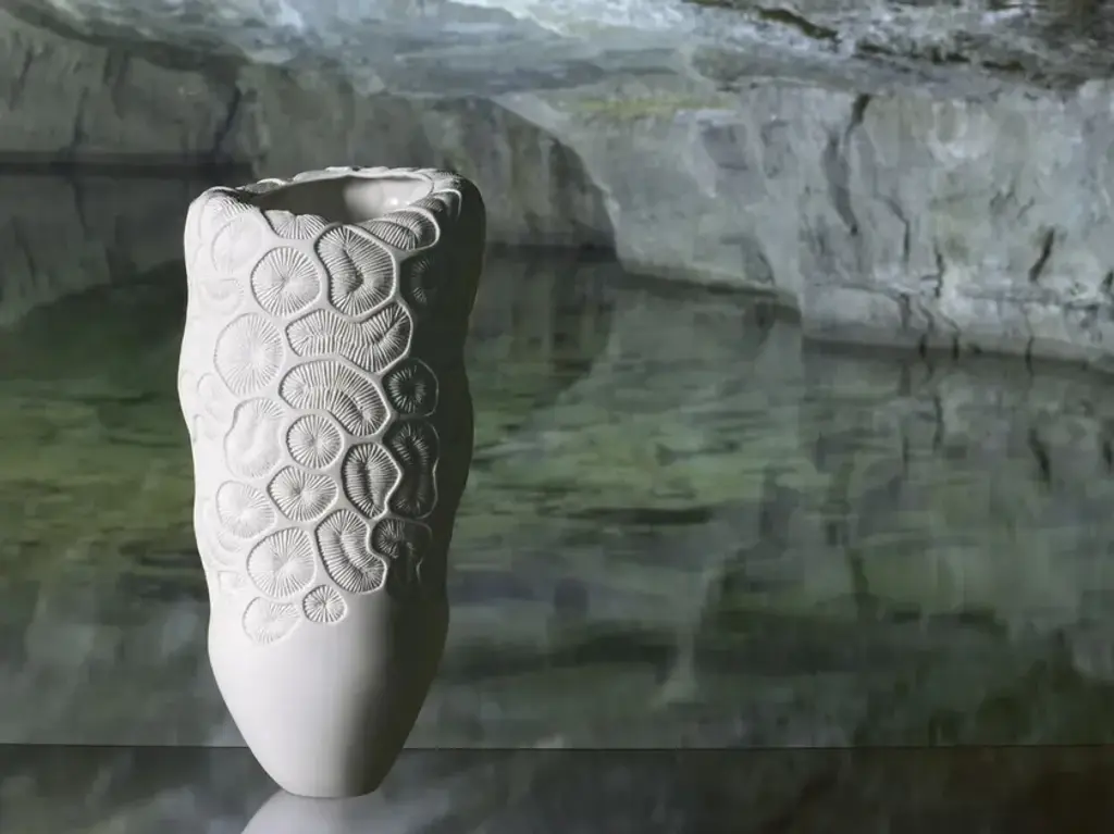 - Handcrafted vase made of cow bone and wood from Colombia. - Almond shaped bone is intricately inlaid to create a unique aesthetic and finished with high-gloss lacquer.
