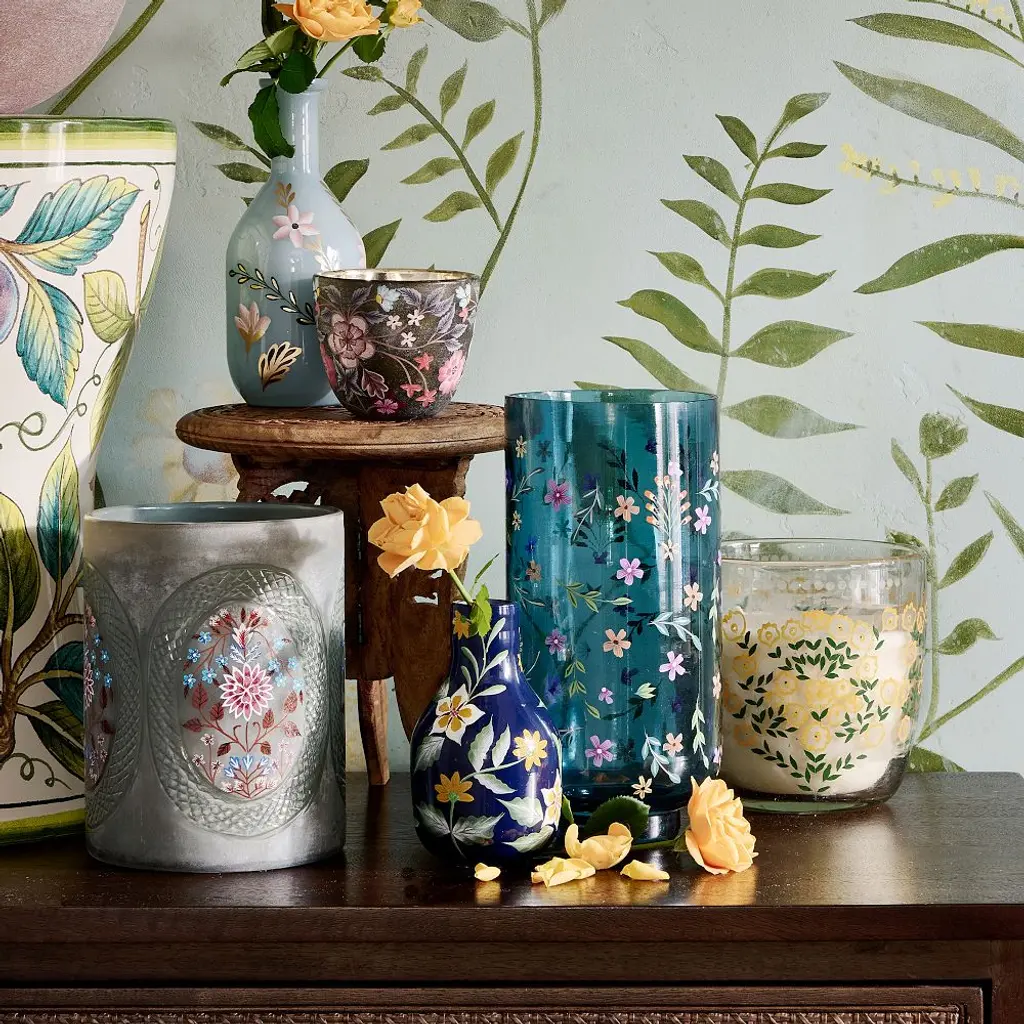 Lasting beauty. Hand-painted by Indian artisans on recycled soda glass, these vases revive traditional craft techniques. Mass them together for a curated display.
