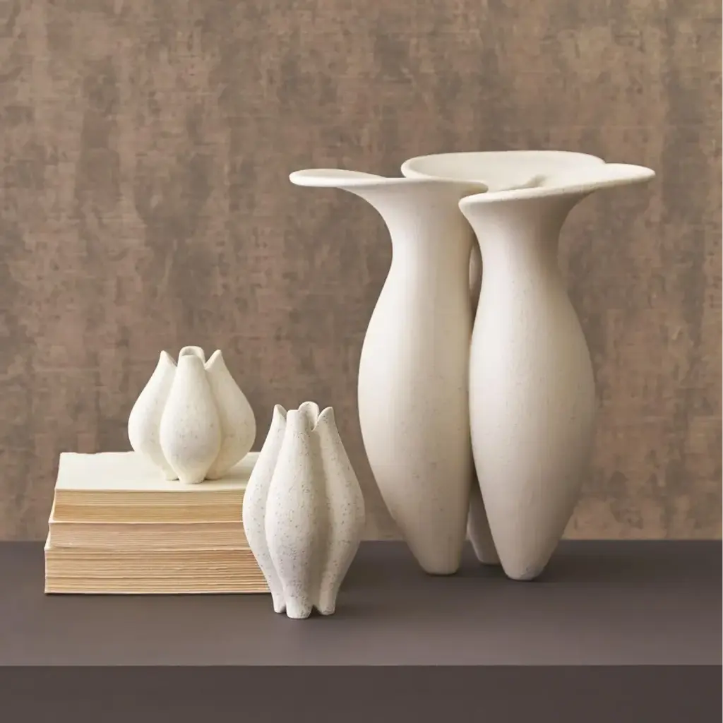 A cousin to the Pond Collection, the Lily Pad Vase seemingly joins three petite vases into one forming a lily pad at the top. The pebbly, rough exterior juxtaposed with smooth glazed interiors speaks to something truly found in nature. Reactive glaze on ceramic. Not water tight. From a fashion forward perspective, Global Views offers accessories, furniture, statement lighting, and an assortment of rugs and mirrors to add beauty and joy to your home.
