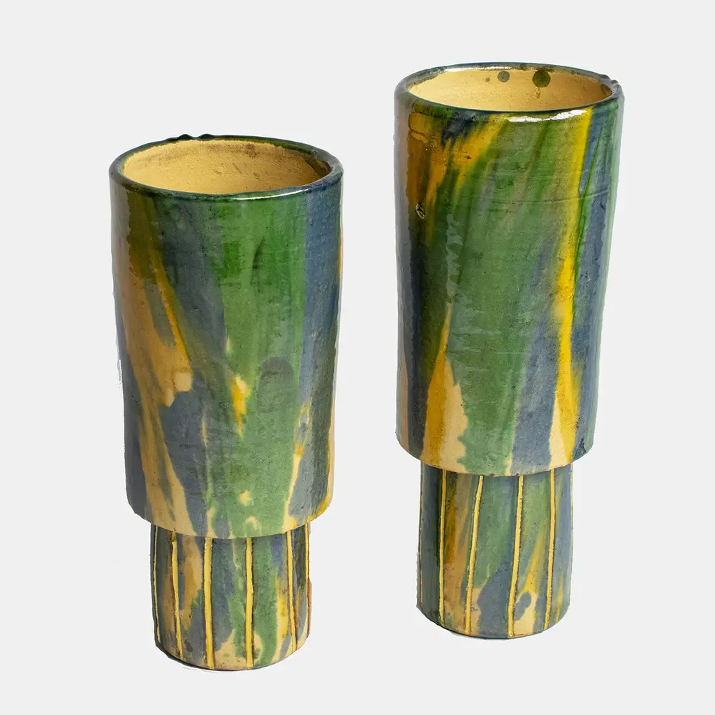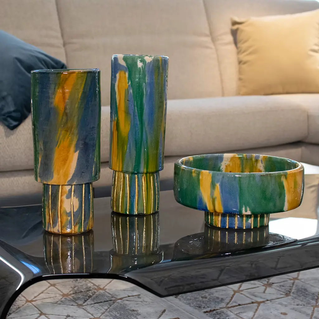 Part of the Linea Collection, this vase by Signora Luna is an objet d'art of sleek sophistication, distinguished by its clean lines and vibrant color palette. This piece boasts a unique two-tiered design, with the base accentuated by intricately embellished lines of gold leaf. Handcrafted by skilled artisans using ancient techniques, this vase embodies the rich tradition of Calabrian ceramic craftsmanship from Seminara. The final touch of gilding involves delicate gold leaf application.