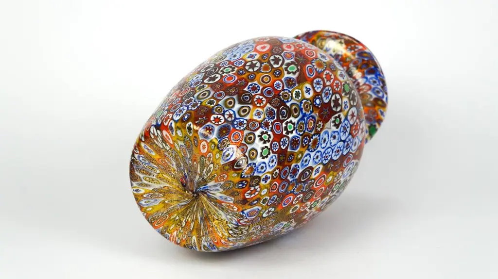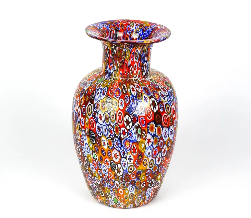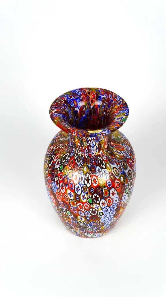 Exclusive working of Murano glass to produce this fantastic venetian blown glass vase with murrine Millefiori and covered with gold leaf 24 carats. This work is unique in the world for its combination of colors, elegance and sophistication. The placement of murrine shall be carried out with care and precision by Murano artisans.Small pieces are carefully placed one by one in a hot-plate and after them melted together with Murano crystals making a colourful mosaic.Executed by Campanella Livio in the 1980s and then reproduced in the following years until today.Each item is produced with venetian glass and each piece is slightly different from other ones due to its handcrafted characteristic.Nothing is more valuable and important than a beautiful vase to embellish your home.