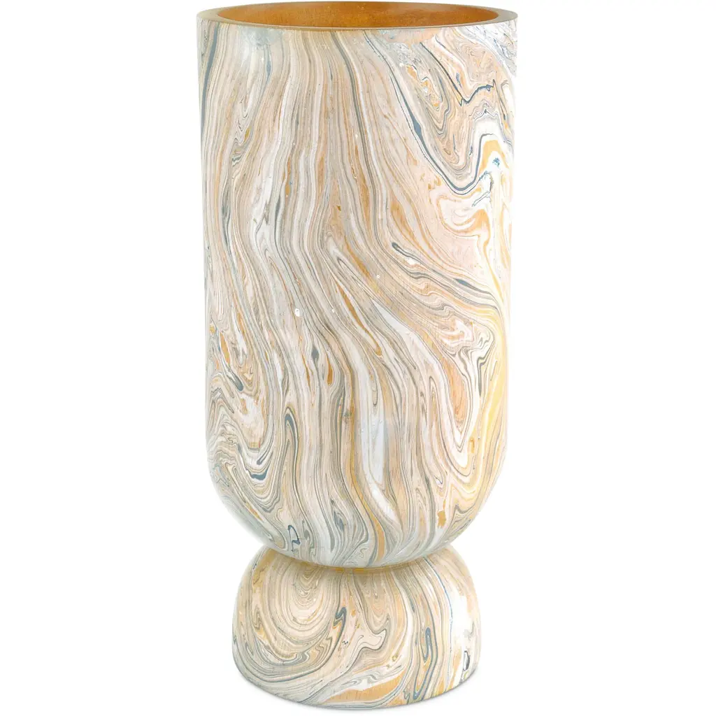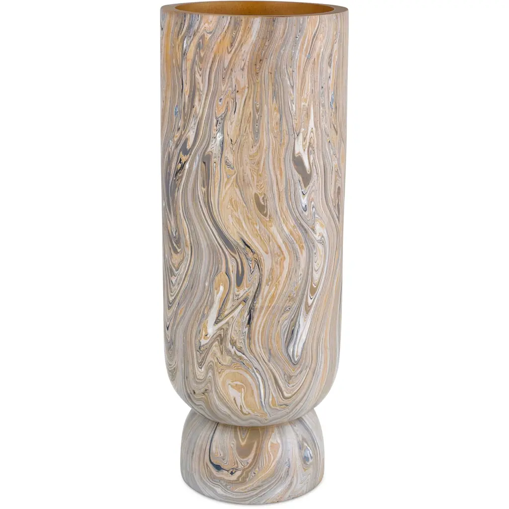 Made of wood, the London Sky Vase Set includes three gray and peach vases with swirling patterns along their surfaces, which have been hand-painted for a marbleized effect. The neutral tones of tan, peach, white, and gray bring these tan decorative accessories a textural feel. The patterning on these multicolored vases will make them dynamic elements in a room.