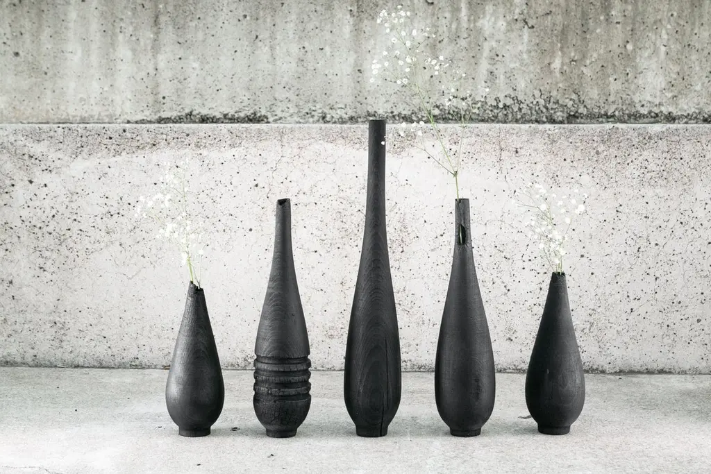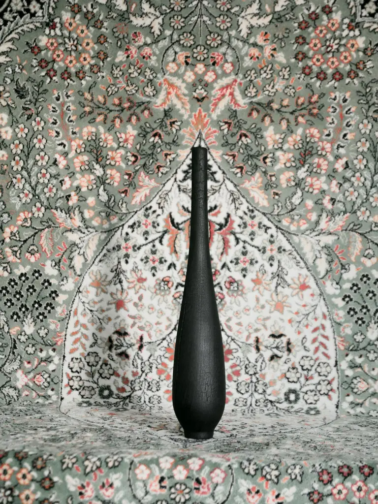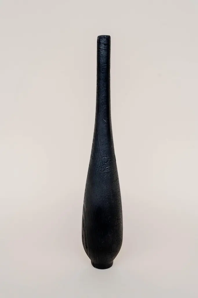 Long Burnt vase by Daniel ElkayamOne of a KindDimensions: D 10 x W 10 x H 40 cm Materials: Burnt Beech WoodJerusalem-born Art-designer and Photographer based in Tel-Aviv. Operating in the field of sustainable home decor and specializing in conceptual design, material exploring, and story-telling through objects. Graduated in 2019 his Bachelor's studies at the Industrial design department at Bezalel Academy of Arts and Design, Jerusalem. A former member of the Bezalel Alumni Design Incubator 2020. Won the excellent scholarship of America-Israel cultural foundation of 2019 Inspired by nature and its phenomenons, the artist transforms natural materials and aesthetics into one-of-a-kind unique objects. In his works, Daniel implements his curiosity and yearning for unrefined aesthetics, and by material transformation and unique techniques he is developing in his studio, he shows how unattractive materials can be not only valid but luxurious. Elkayam examines the range between art and design by taking things in and out of their context, creating hybrids between different worlds of content, intervening in natural processes, while leaving a gap for the unexpected, the unknown. He expresses his inner world and illustrates his ideas by creating objects and experiences. Through his perspective of materiality, and empathetic vision of his surroundings, he developed an intuitive way of creation with experimental materials such as algae, corrosion, charcoal, and more. Every collection of objects expresses different material research and follows curious narratives and a variety of topics such as locality, transience, and decay of materials. THE CHARRED COLLECTION: A collection of handmade wooden objects inspired by one of the most powerful natural phenomena in our world, which is out of control. Today the percentage of fires caused by natural causes is significantly lower than those caused by humans. The huge fires quickly deplete the forests, leaving behind a particularly surrealistic view of a burnt, black piece of nature. Out of interest in this show was created the desire to preserve the unique aesthetics of the burnt wood and to express in objects the feelings and questions it raises as a raw material in itself. The same scorched aesthetic combined with everyday objects, on the one hand, serves as a mirror for the consequences of the situation we have created and as a means of dealing with its ecological results, and on the other hand, as a visual echo of fire intensity and aesthetic effects.