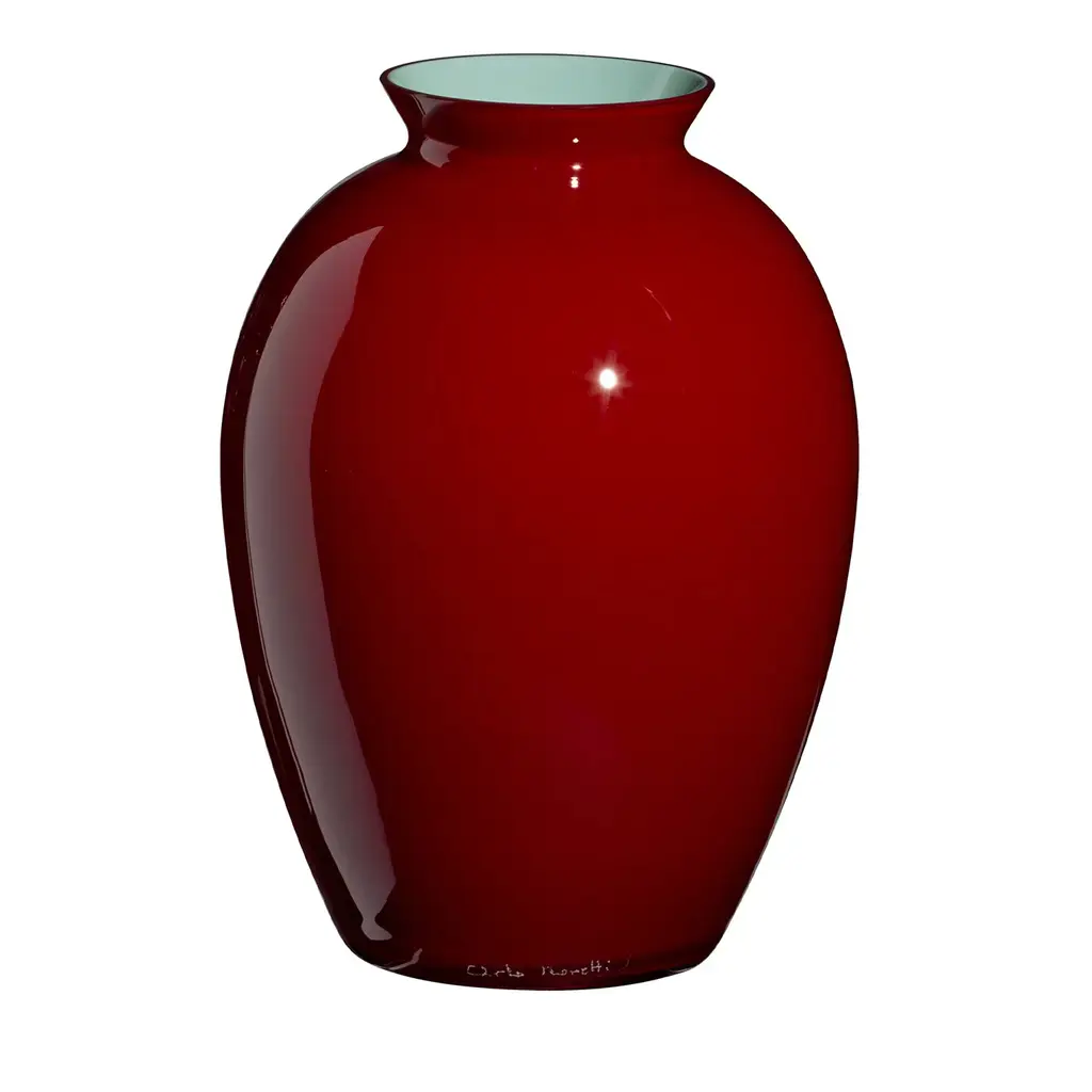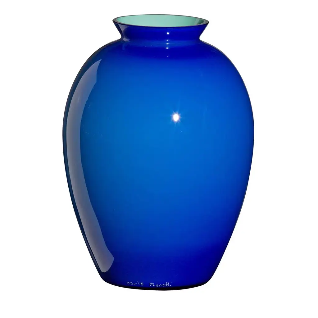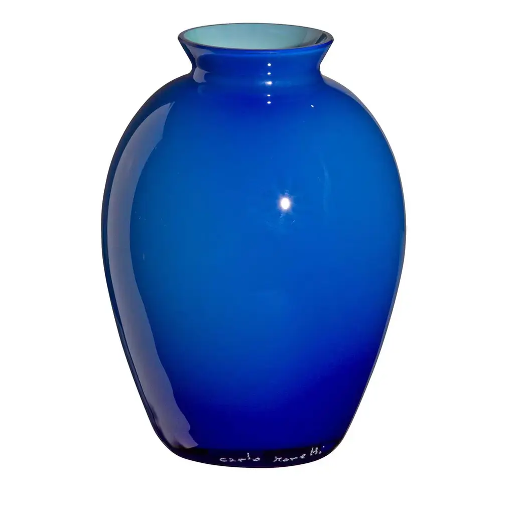 A classic, unadorned shape made unique by a vibrant tone of yellow on the outside defines the joyful flair of this glossy Murano crystal vase, singular artwork mouth-blown, finished, and signed by artist Carlo Moretti. The quiet beige tone accenting the inner surface is revealed through the delicately flared mouth. Please ask the Concierge for other color and size options.