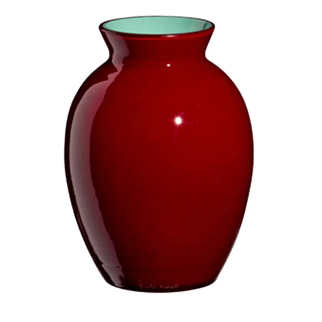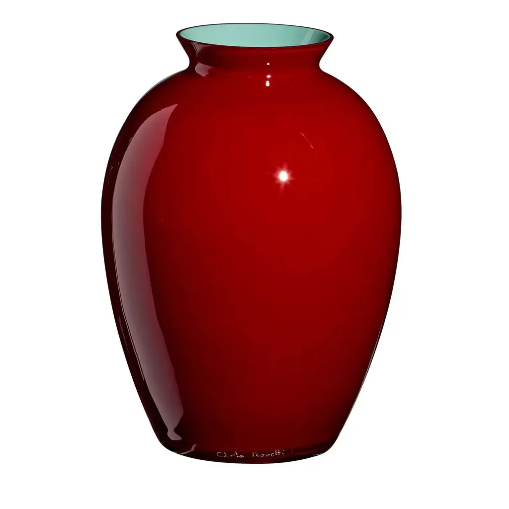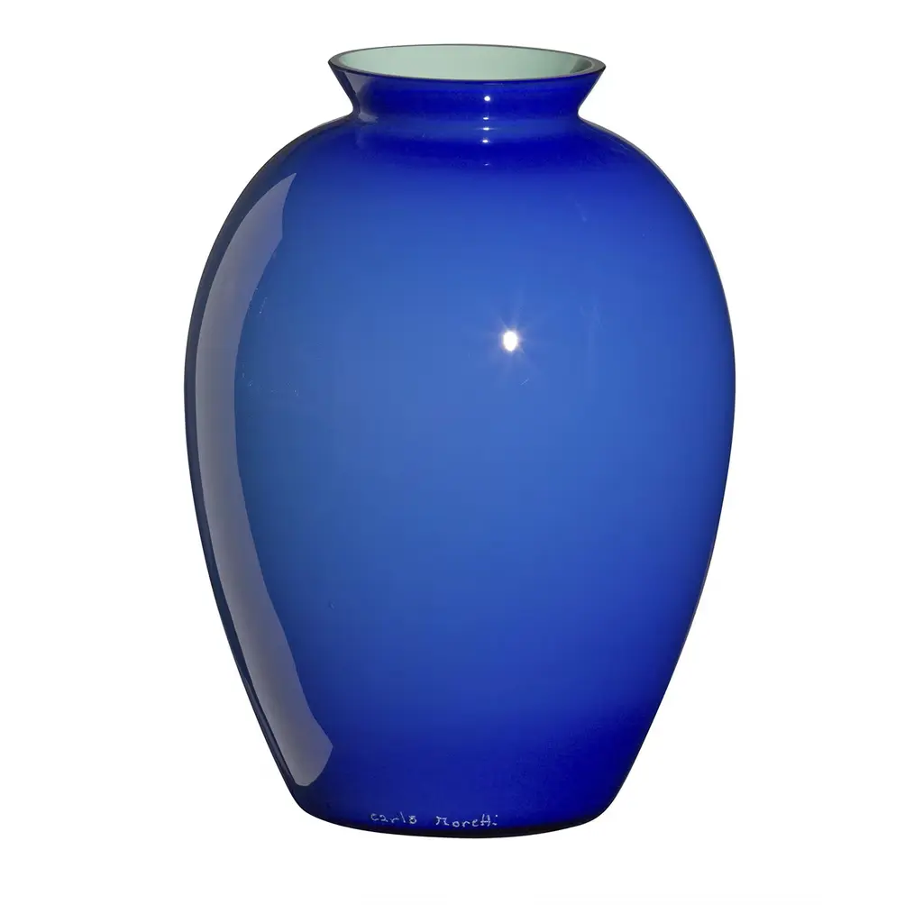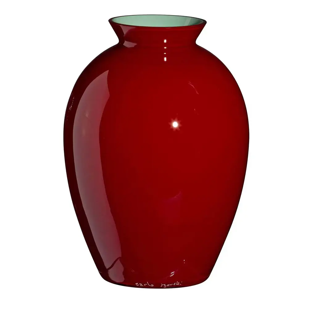 A classic, unadorned shape made unique by a vibrant tone of yellow on the outside defines the joyful flair of this glossy Murano crystal vase, singular artwork mouth-blown, finished, and signed by artist Carlo Moretti. The quiet beige tone accenting the inner surface is revealed through the delicately flared mouth. Please ask the Concierge for other color and size options.