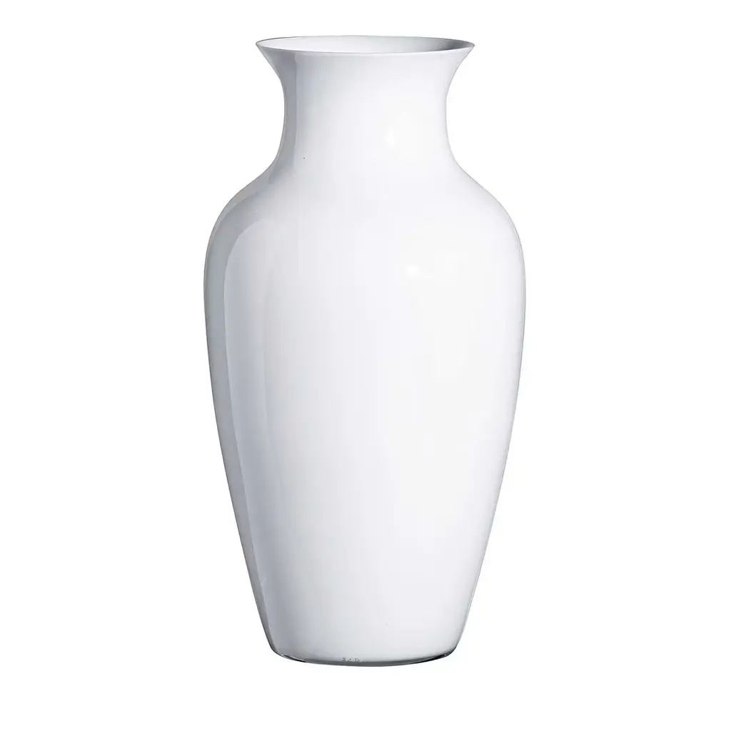 Marked by a harmonious, rounded body flowing into a softly flared mouth that welcomes colorful floral compositions, this luminous vase in pure-white Murano crystal distills timeless elegance. A creative mouth-blowing process sealed by a careful finishing step carried out by hand seals the singular quality of every object by Carlo Moretti.
